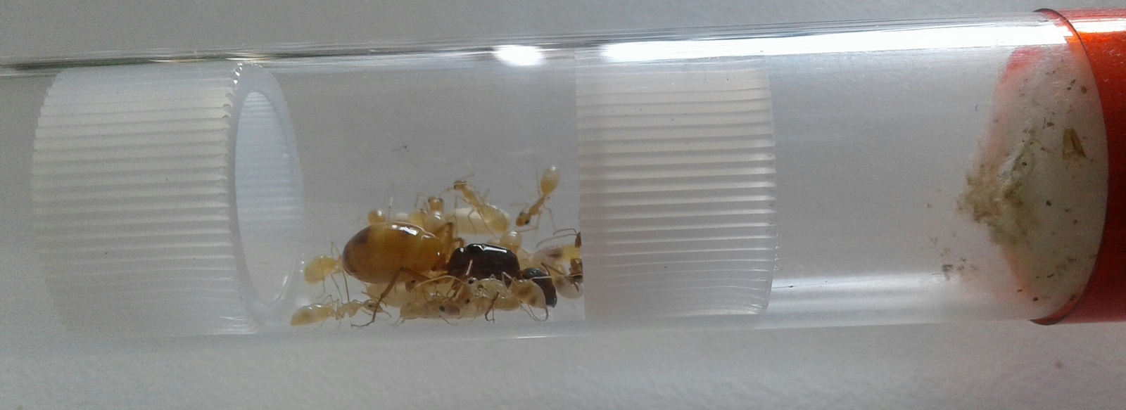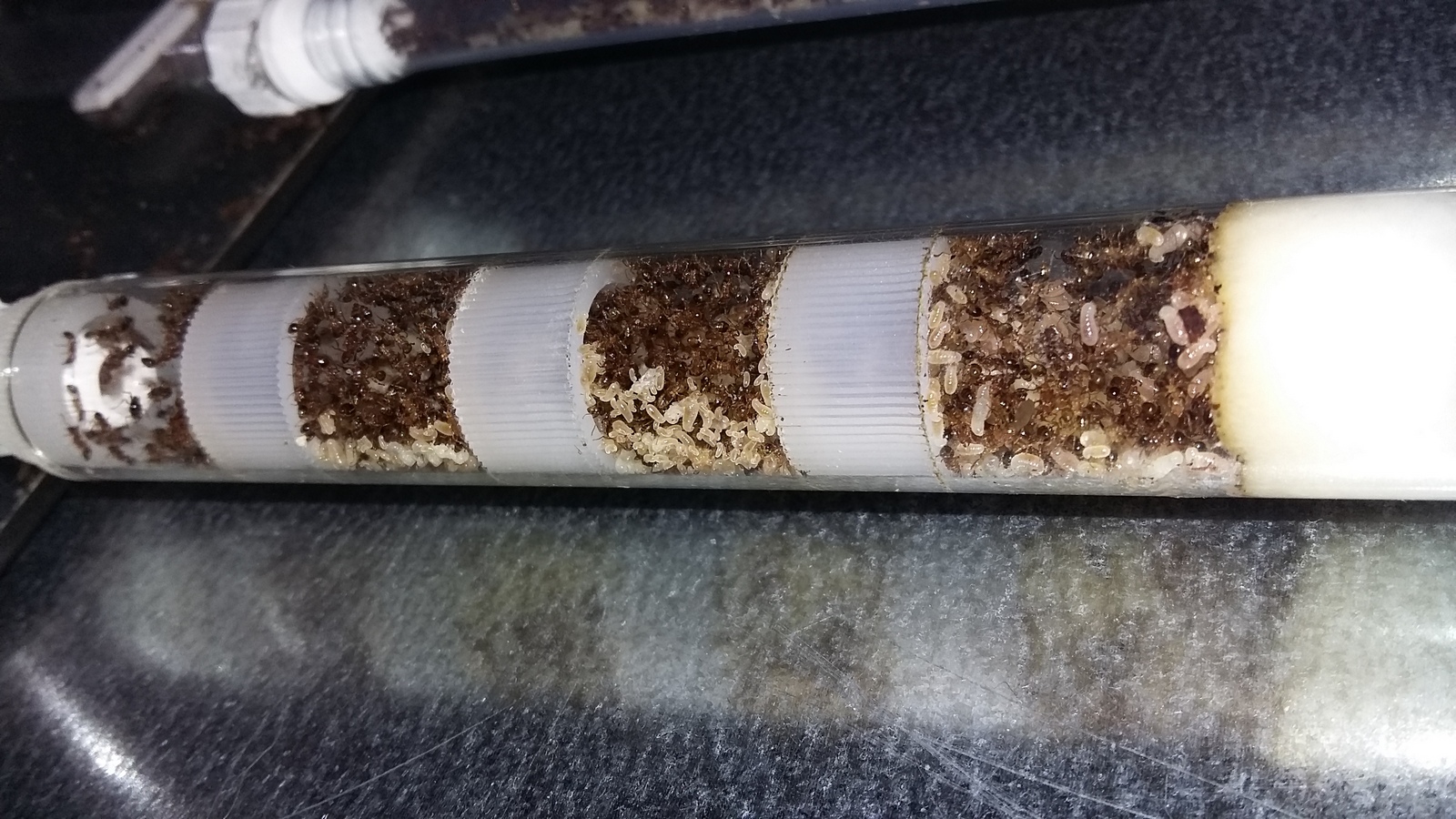 W probówce na powyższym zdjęciu najwyższa wilgotność będzie rzecz jasna panować w komorze najbliżej waty, a w komorze przy wejściu będzie najbardziej sucho. W tej ostatniej mrówki zbierające nasiona będą przechowywać swoje skarby.