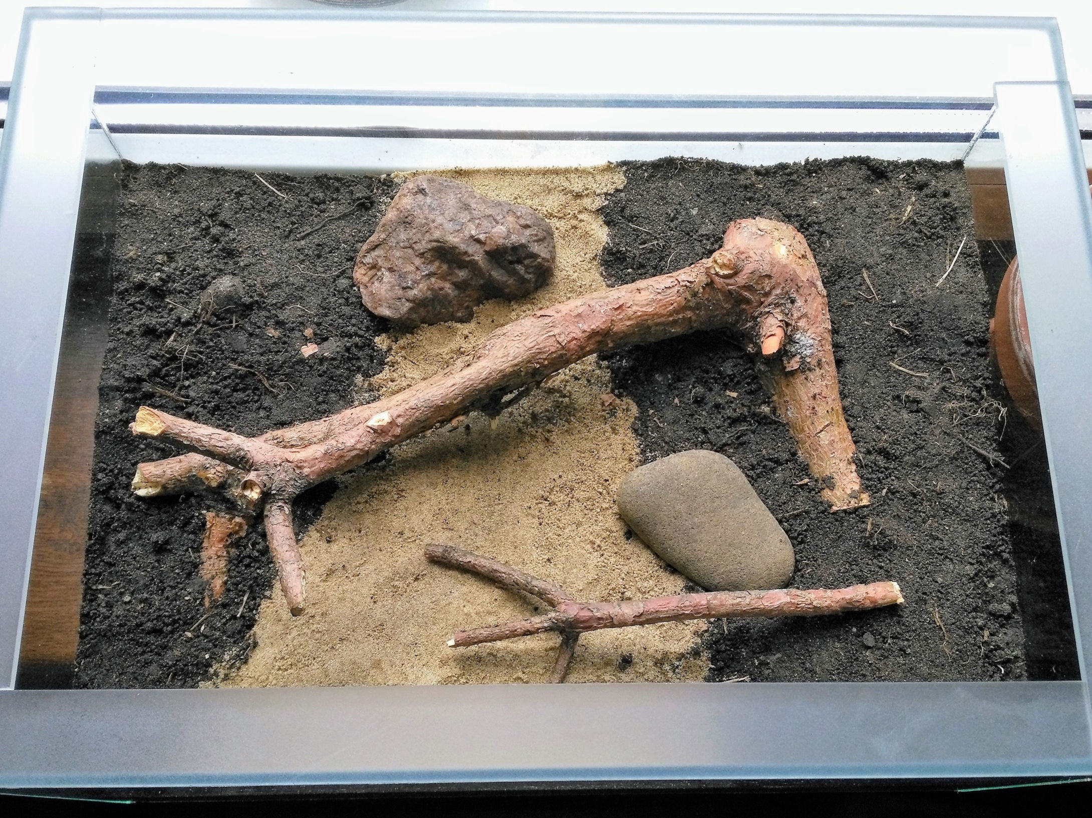 Na dnie poukładałem dość sporo kamieni i patyków. Mają one stanowić rusztowanie, żeby nie zawalały się komory mrówkom.