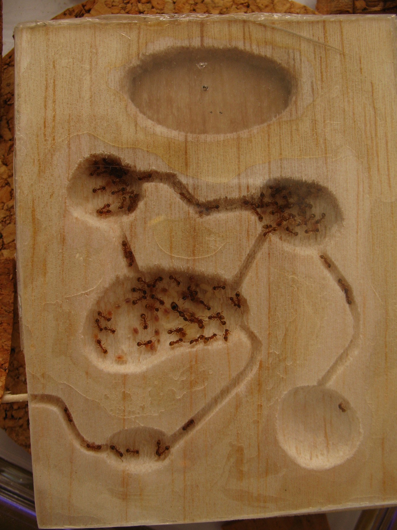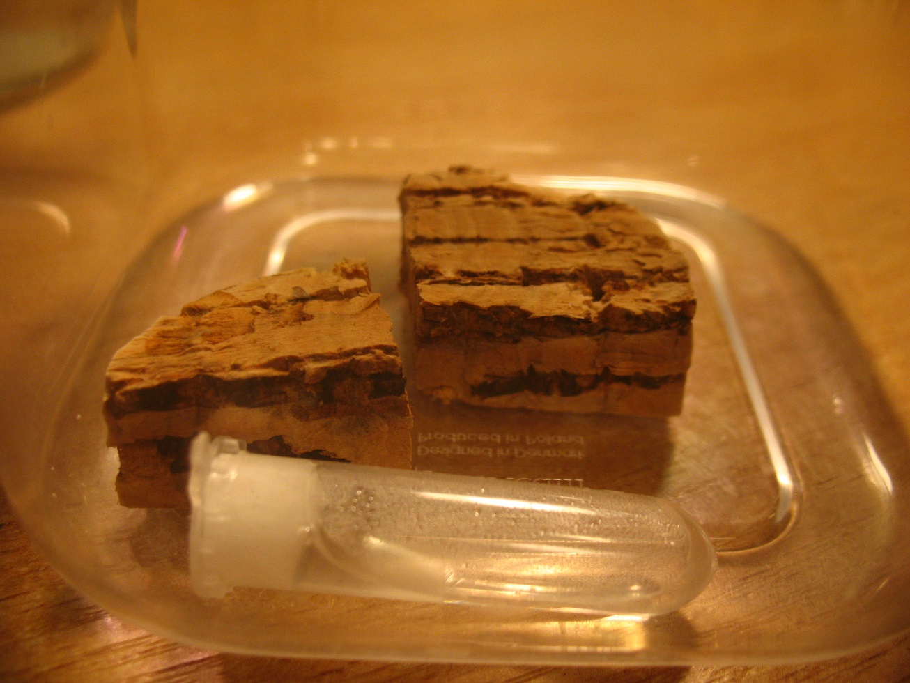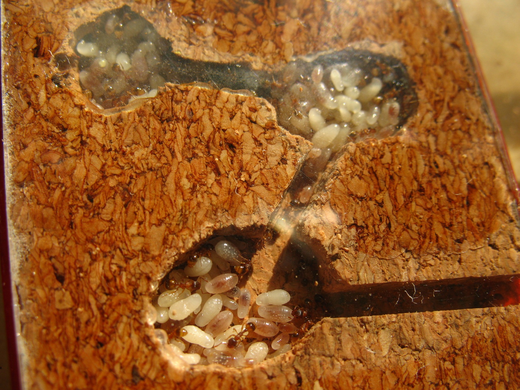 W tym korku, zgadnijcie którym, gniazduje mała kolonia Temnothorax sp. Jeżeli chcesz trzymać te mrówki na arenie innych mrówek i nie chcesz robić im gniazda, wstaw korek z gąsiora. Niemielony, z naturalnymi szczelinami. Kilka kropli wody w jedną ze szczelin co kilka dni im wystarczy.