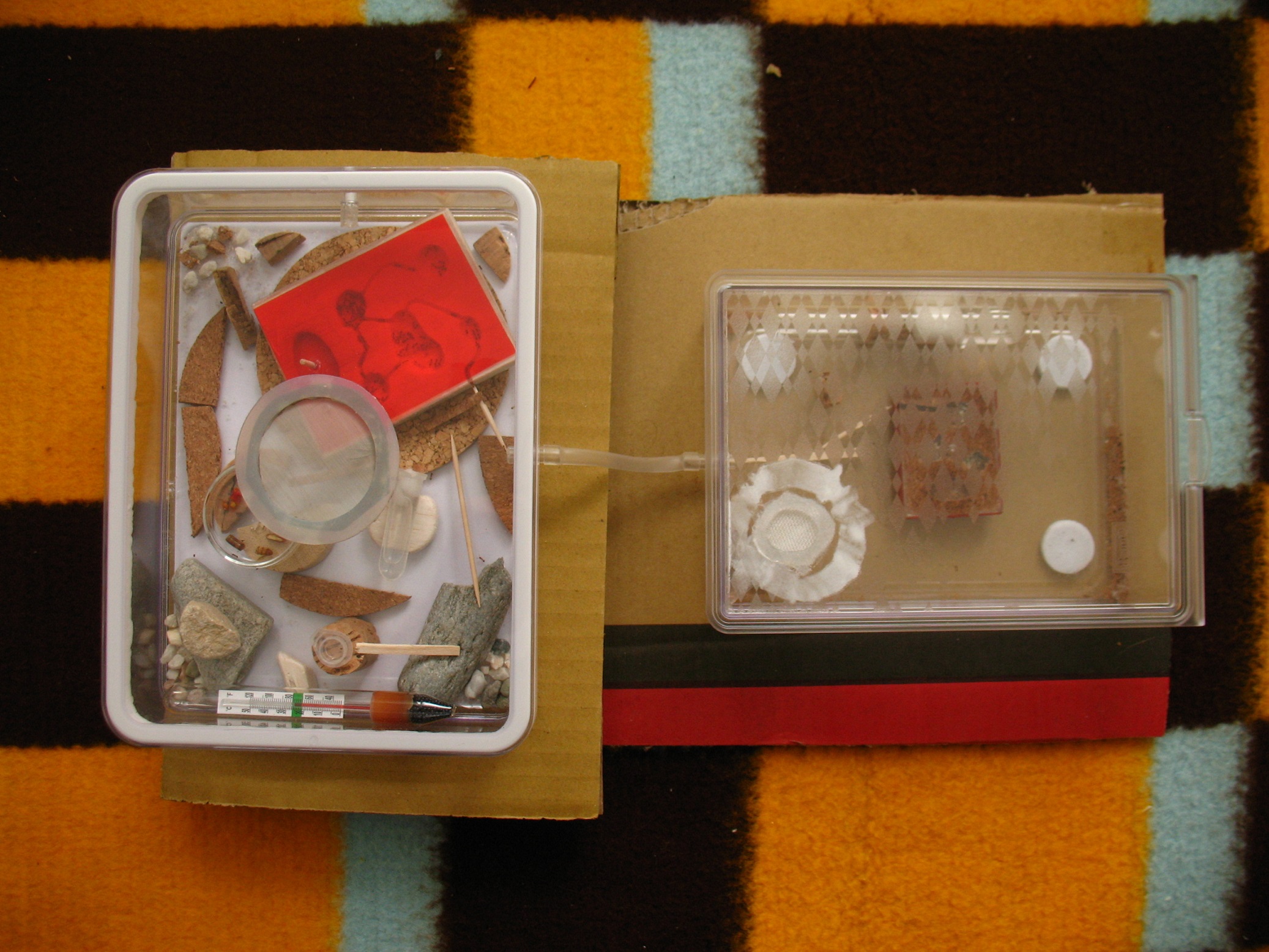 Z powodu nadmiaru zajęć  projekt kolejnego gniazda z balsy zawiesiłem. Zadowoliłem się gotowcem i wprowadziłem tylko małą zmianę. Gniazdo jest nawadniane od góry a mrówki mają dostęp do połowy dolnych komór. Żeby je nawodnić trzeba zalać całą prawą stronę. Im więcej wilgoci, tym więcej miejsca na glony i pleśń. Dla tego postanowiłem zrobić mały otwór w dolnej części i nawadniać gniazdo od dołu.  Jak mrówki dokopią się do końca zacznę nawadniać od góry, żeby nie lać im wody prosto w gacie.  Żeby za bardzo nie ingerować w konstrukcję gniazda (chociaż bardzo mnie korciło  Smile ) pomiar warunków życiowych rozwiązałem w ten sposób.