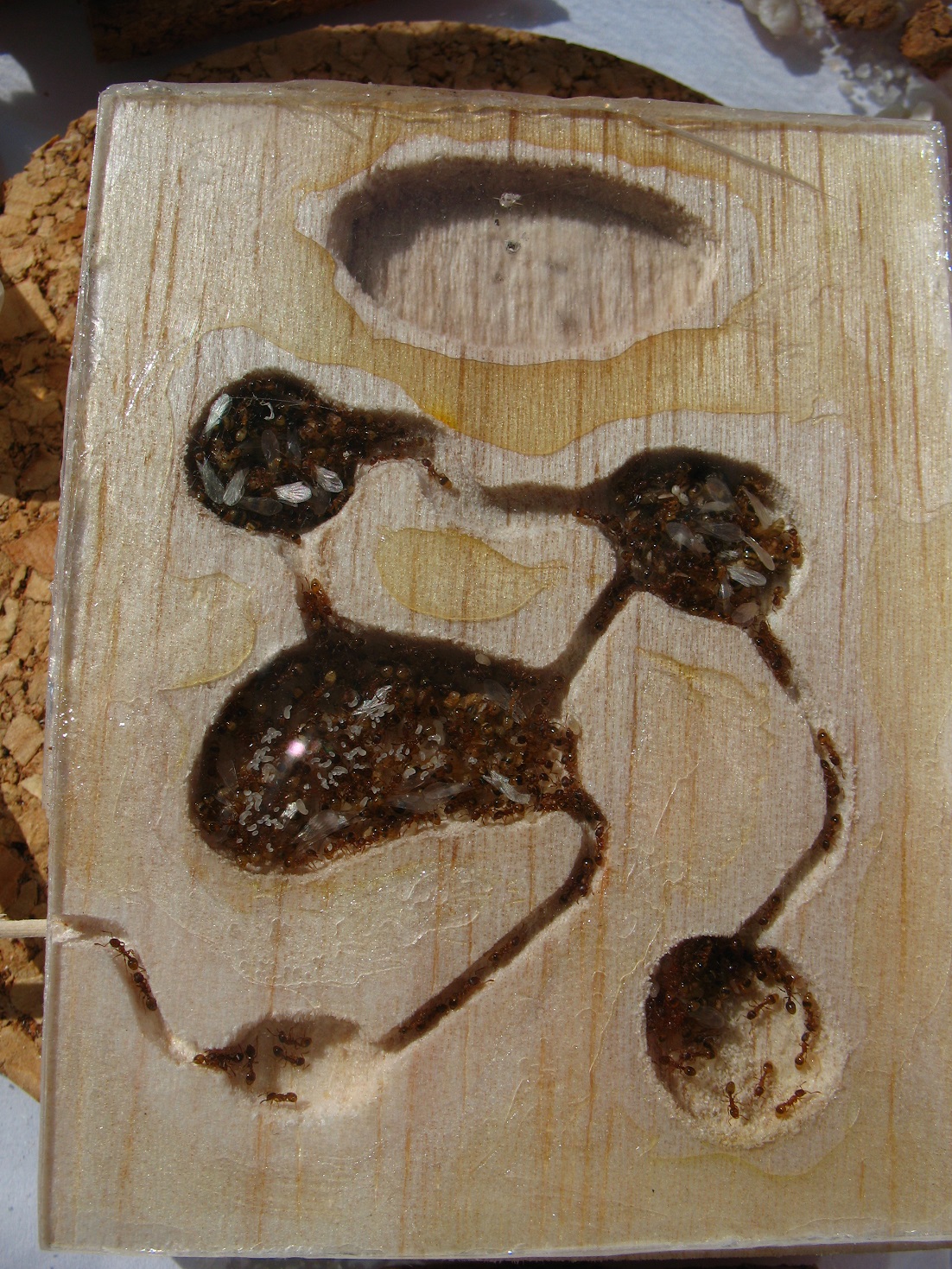 I pomimo, że po wprowadzeniu mrówki zajmowały pół gniazda to po miesiącu zaczęły korzystać z probówki którą olewały od samego początku. Byłem zdumiony przyrostem potomstwa i zachwycony koniecznością budowy kolejnego gniazda. Padło na tajemniczą balsę. Kupiłem deskę 8mm w modelarskim, pożyczyłem małą szlifierkę z głowicami  i przeniosłem się do mojego świata mrówek Smile. Głowice się przydały, szlifierka nie. W balsie pracuje się bardzo przyjemnie. Kształt komór ponacinałem tapeciakiem, potem zrobiłem nacięcia wzdłuż włókien co 1mm i powstałe listewki wyskrobywałem. Wykończyłem ręcznie głowicami do szlifowania. Trzeba być delikatnym, balsa jest miękka, omsknie się ręka i zostaje rysa.  Komora nawadniająca jest umiejscowiona tak, żeby woda mogła przemieszczać się naczyniami. W drewnie przesiąkanie zawsze będzie się odbywać szybciej wzdłuż włókien. Tym razem obkleiłem plastikiem górę, dół, i 2,5 boku. Część boków najdalszą komorze nawadniającej zostawiłem żeby drewno w tej części było zawsze suche. No i dwie dziurki do komory nawadniającej, jedna na igłę, druga odpowietrzacz. Gniazdo było gotowe.