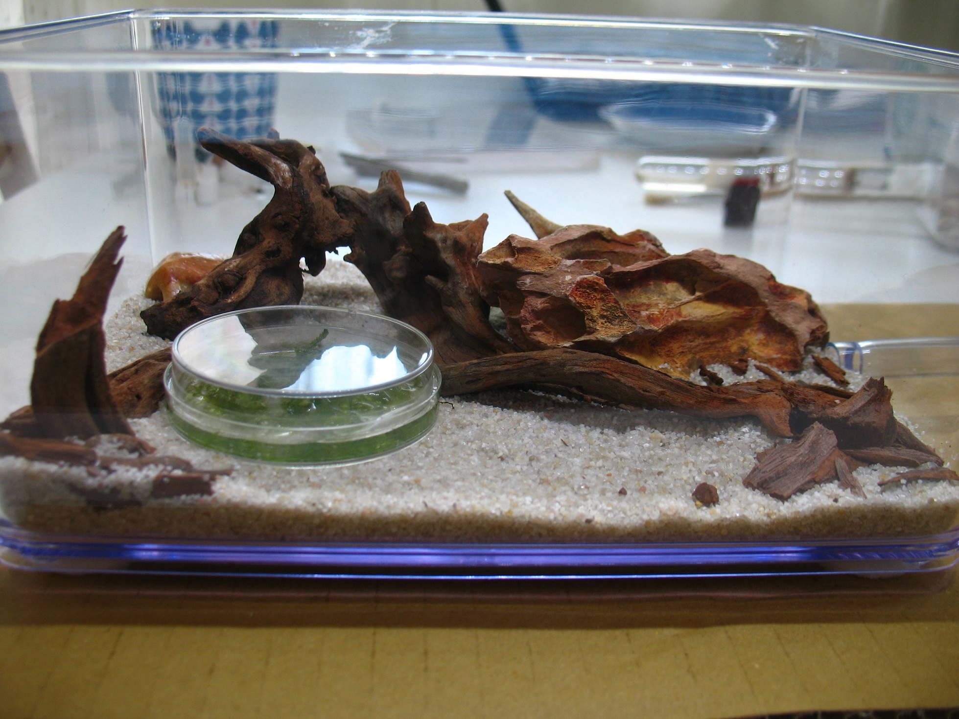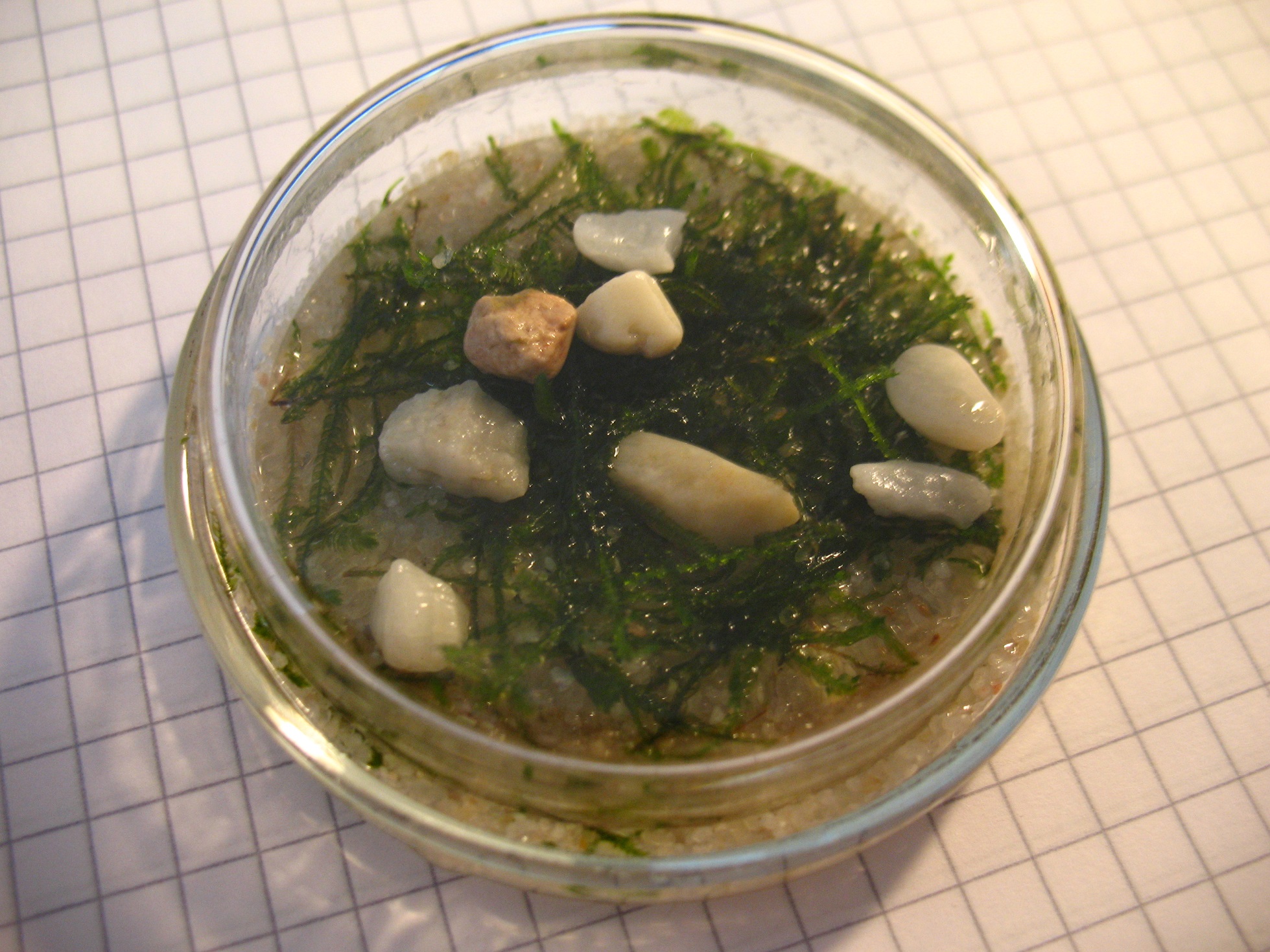 Przy szalce bez otworów wentylacyjnych i dziurki piasek dodatkowo podsiąka i gromadzi wodę wewnątrz szakli. Zalecam wystój pochodzenia mineralnego przepłukany wrzątkiem, odradzam stosowania rzeczy organicznych: części roślin, korzenie. Raz w tygodniu roślinę wyciągamy i płuczemy w odstanej wodzie, szalkę czyścimy wacikiem pod bieżącą wodą, wystrój ja osobiście wymieniam nie bawię się w płukanie. Przycinać nożyczkami lub rozrywać. Najlepiej stosować rośliny kupione w akwarystycznym i przez internet lub od znajomych z ustabilizowanym akwarium. Wtedy mamy pewność, że na roślinie nie będzie żadnych szkodliwych mikrobów i pasożytów. Rośliny kupione w żelu trzeba z niego dokładnie wypłukać. Jeżeli arena jest w bardzo zacienionym miejscu to Mech jawajski można doświetlać zwykłą lampką biurkową z żarówką led przez kilka godzin dziennie. W przypadku utrudnień z pielęgnacją np. wyjazd, mech można przełożyć do większego naczynia z wodą lub do probówki zatkanej korkiem z odrobiną wody. Proste poidełko dla mrówek z ładną rośliną która dodatkowo oczyszcza wodę dla naszych podopiecznych z toksyn. Poidełko zalecam dla większych mrówek np. Camponotus, Formica, szczelina ma ponad 1mm, małe mrówki mogą się potopić.