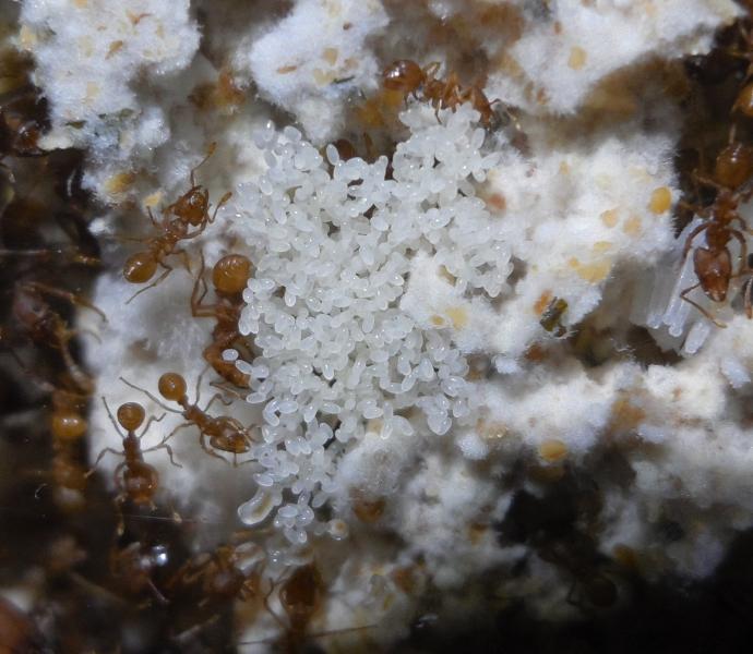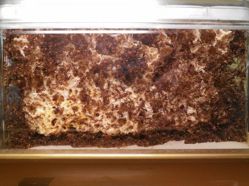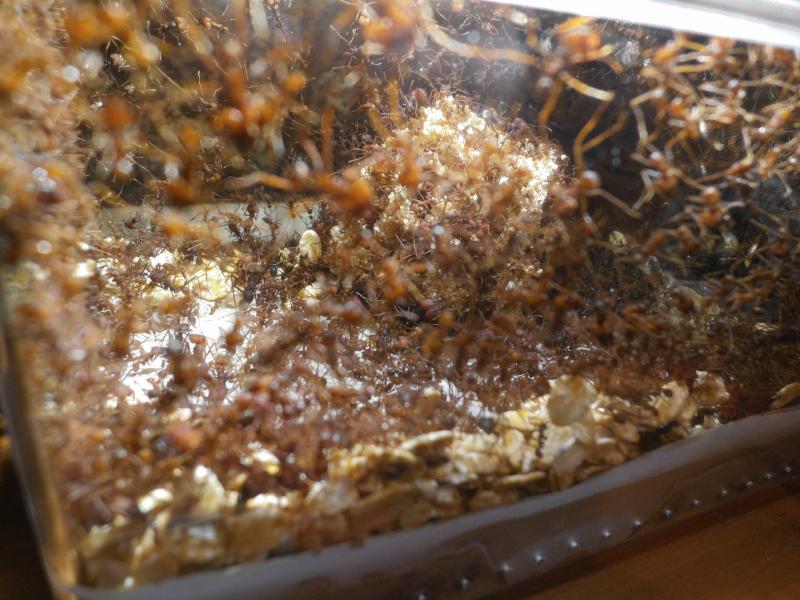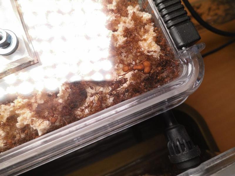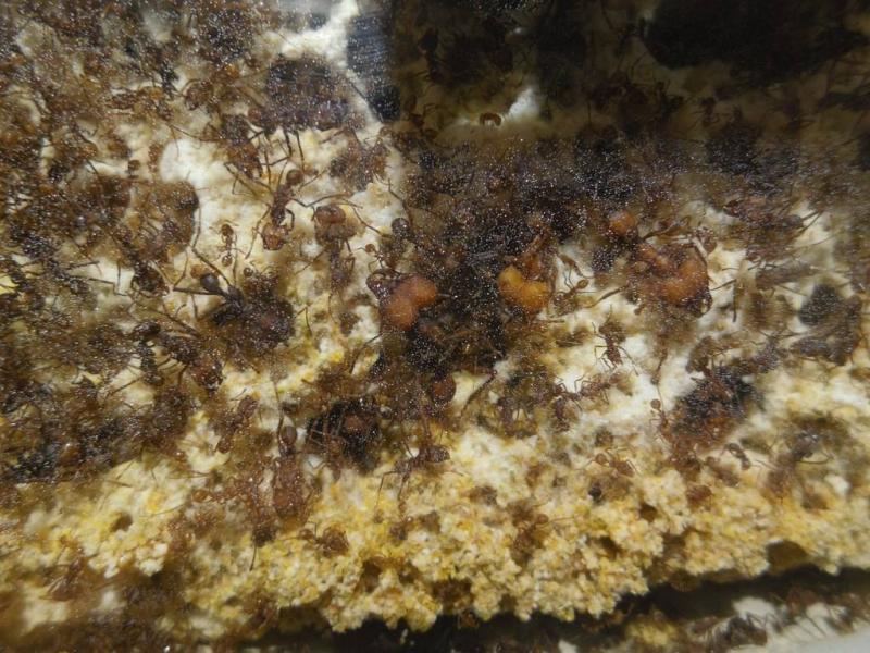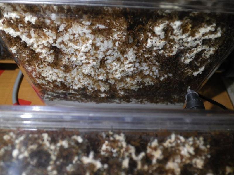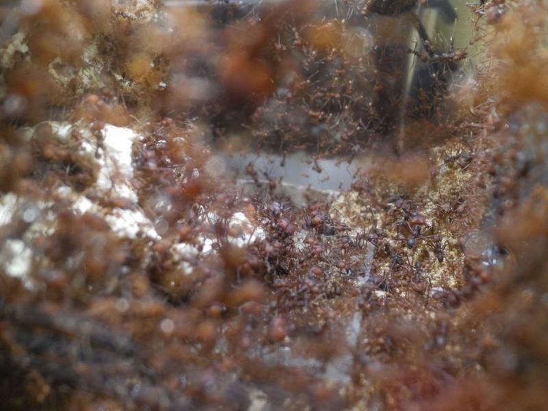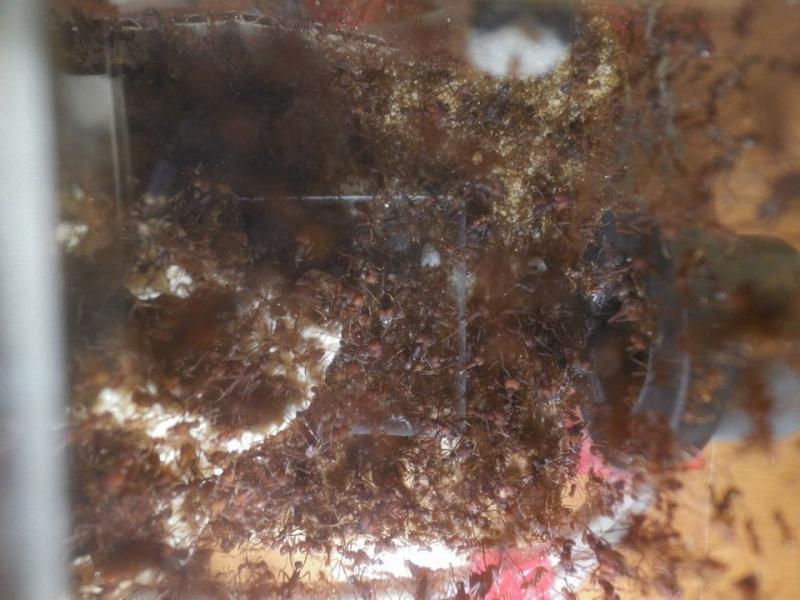 Kolonia w dalszym ciągu nie otrzymała nowych pojemników, choć powinno nastąpić to już niedługo, gdyż mam zgromadzone wszystkie niezbędne komponenty. Nie przeszkadza to jednak mrówkom w ciągłym przyroście, co skutkuje dosłownie ścianami robotnic zapełniającymi powierzchnię pojemników. Stan liczebny kolonii szacuję na 8-9 tysięcy robotnic. Trzon populacji stanowią oczywiście te najdrobniejsze (~2 mm), których na samej górnej powierzchni grzyba w jednym tylko pojemniku można naliczyć blisko 800 szt. Poczwarki i larwy w różnych stadiach są bez przerwy obecne, co sugeruje, że królowa nadal żyje. Niestety nie widziałem jej już ani razu od poprzedniego wpisu.
