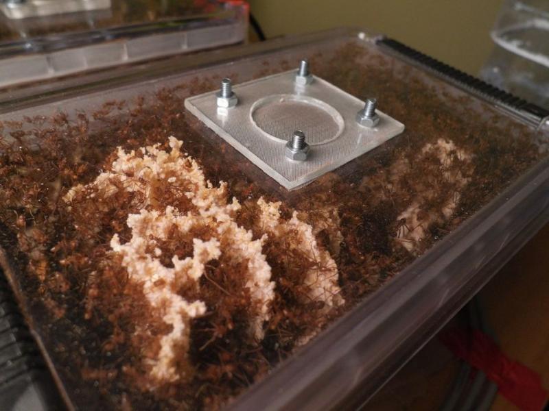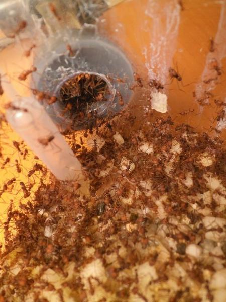 Kolonia tętni życiem. Nowe pojemniki stopniowo się zapełniają. Co ciekawe, wcześniej mrówki podbierały stosunkowo niewielkie ilości z grzyba 'bazowego', żeby stworzyć zalążek nowego ogródka w innym miejscu. Dalszy rozrost w nowej lokalizacji zależny był jedynie od dokładanego pokarmu. W przypadku najnowszych pojemników było inaczej. Mrówki na dużą skalę rozbierały szczytową (najświeższą) warstwę ogródka w starszych pojemnikach, a następnie transportowały do nowo dołączonych i tworzyły z tego swoją konstrukcję. Tym sposobem nowy ogródek w ciągu zaledwie kilku dni stał się monumentalny, ale za to oczywiście wysokość grzyba w pozostałych pojemnikach zmalała. Z czasem jednak mrówki przystąpiły do odbudowy. Dzięki rozbiórce miałem możliwość zobaczyć królową. Przesiaduje ona u szczytu. Po pewnym czasie odbudowana warstwa ogródka znów ją zasłoniła.
