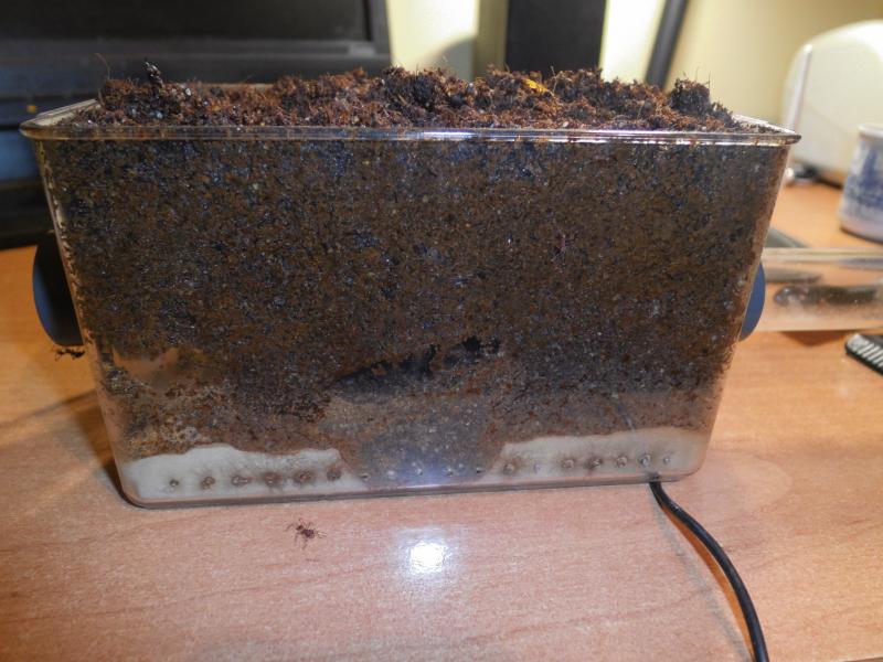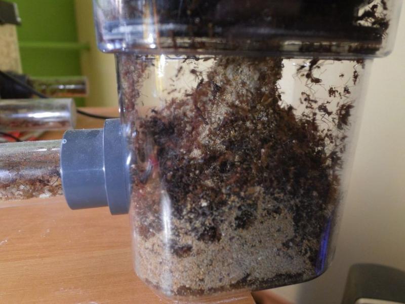 Brak fluonu skutkuje tym, że pojemnik na odpady jest przykryty pokrywką z otworem zabezpieczonym siatką. Uniemożliwia to częste i regularne opróżnianie go, a odpady, za sprawą pogorszonej wentylacji, są cały czas wilgotne. W rezultacie zaowocowało to pojawieniem się nowych lokatorów - roztoczy. Początkowo nie były uciążliwe, gdyż nie interesowało ich odwiedzanie ogródków grzybowych, więc pewnie pozwoliłbym im tam mieszkać. Niestety z czasem zaczęły przybierać na liczebności i wychodzić górą śmietnika. Czas tolerancji się skończył. Pojemniki, w których składowane były odpadki zostały odłączone i wyczyszczone. Całe formikarium oraz mebel, na którym konstrukcja stoi, czekało kilkukrotne naprzemiennie przemycie spirytusem i przedmuchanie sprężonym powietrzem. Wokół pokrywki śmietnika teraz dodatkowo nanoszę olej roślinny, aby zmniejszyć szanse na ponowne przedostanie się  tych nieproszonych gości do wnętrza. Mija około miesiąc od tamtych dni, a roztoczy nie zaobserwowałem.