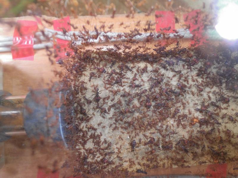 Zanim jeszcze Atta trafiły do mnie, to zastanawiałem się, jakby to było, gdyby umożliwić kolonii zaopatrywanie się w pokarm na własną rękę. Ale przede wszystkim, jakie będą konsekwencje spotkania z rodzimymi gatunkami mrówek. Wcześniej pisałem, że Atta, jako gatunek terytorialny, nie toleruje innych gatunków, i że łączenie ich na wspólnej arenie najprawdopodobniej zakończy się fiaskiem. Rzeczywiście artykuły naukowe mówią, że robotnice innych gatunków grzybiarek są zażarcie eliminowane z sąsiedztwa gniazda, jak i terenu, na którym furażeruje kolonia. Nie ma w tym nic dziwnego, gdyż chodzi zwyczajnie o konkurencję pokarmową. Jak jednak zachowują się Atta, gdy nie muszą rywalizować o liście? Jak zareagują na gatunek wcześniej sobie nieznany i co zrobi przedstawiciel tego gatunku po takim spotkaniu?
