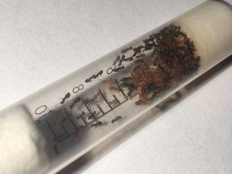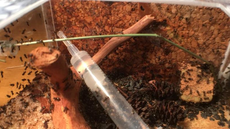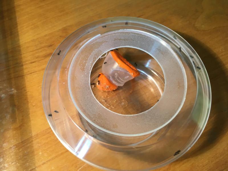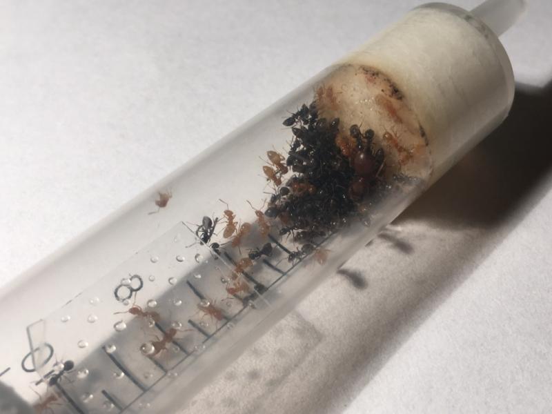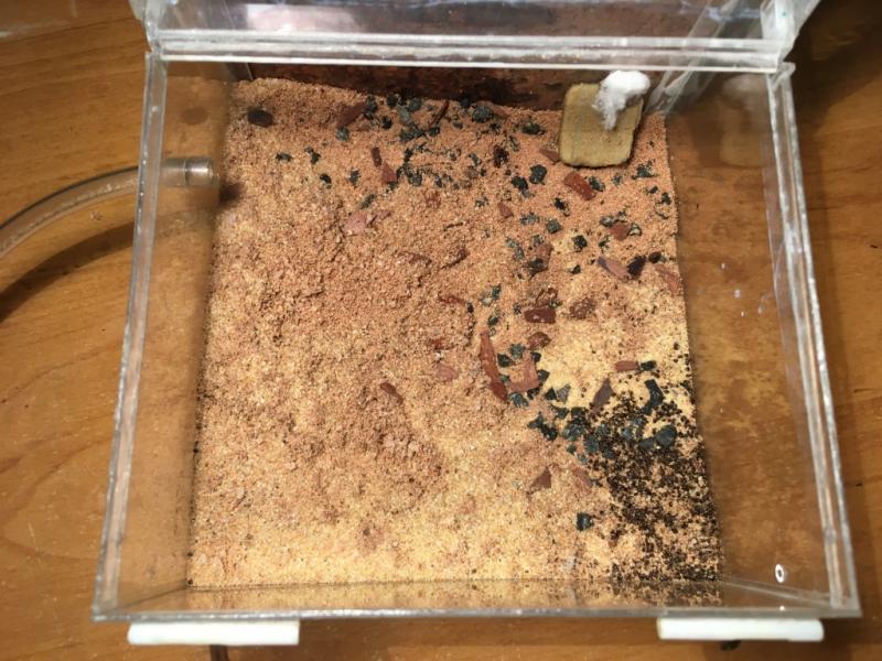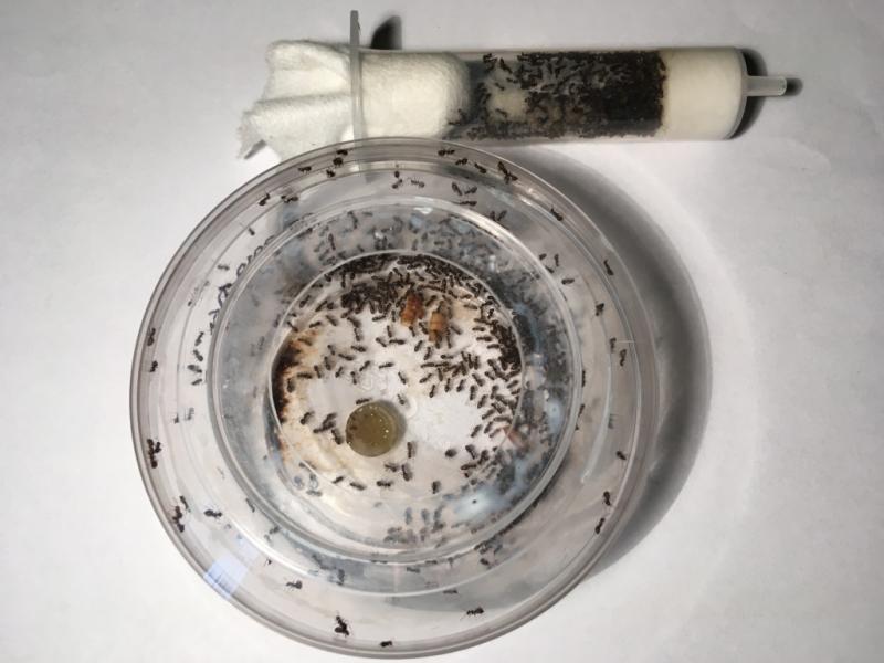 U Chthonolasius padły dwa żółtki, 4x niger i larwy, zostały przeniesione do uciętej strzykawki by cała weszła na arenę:
