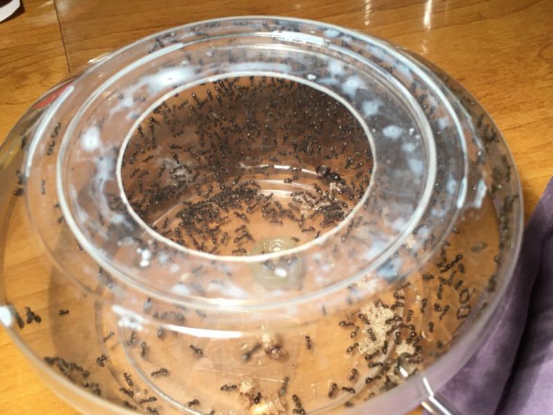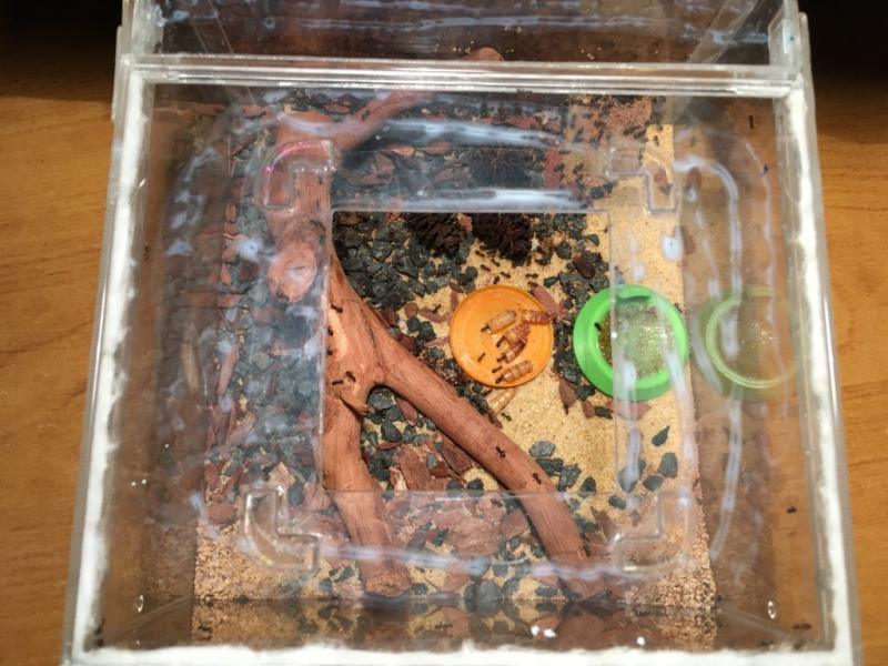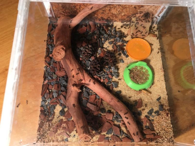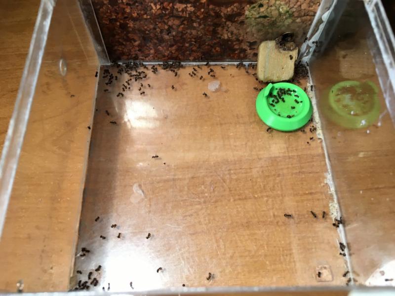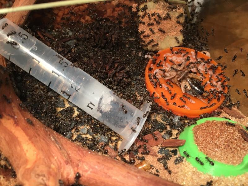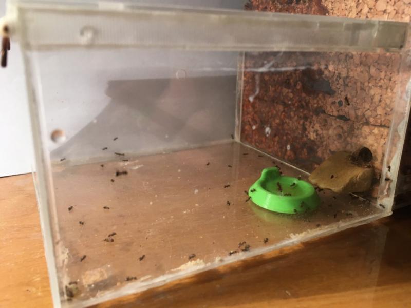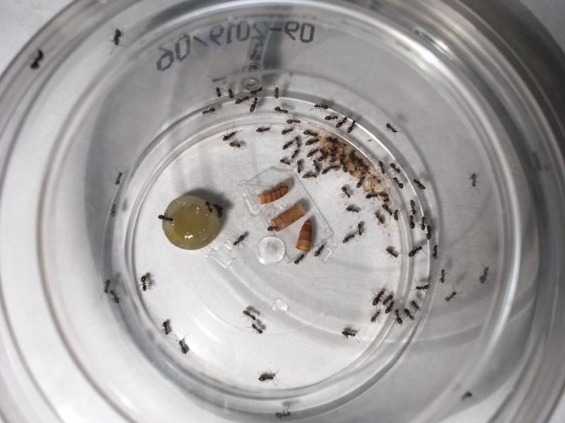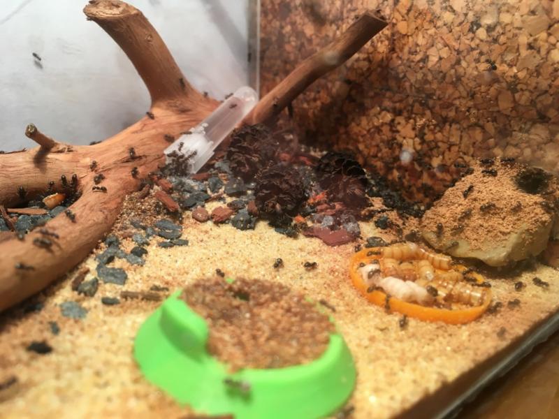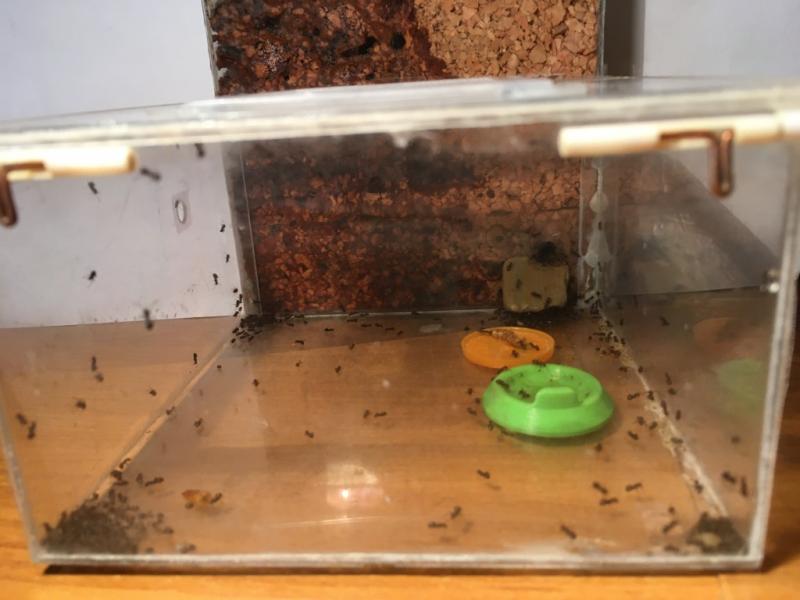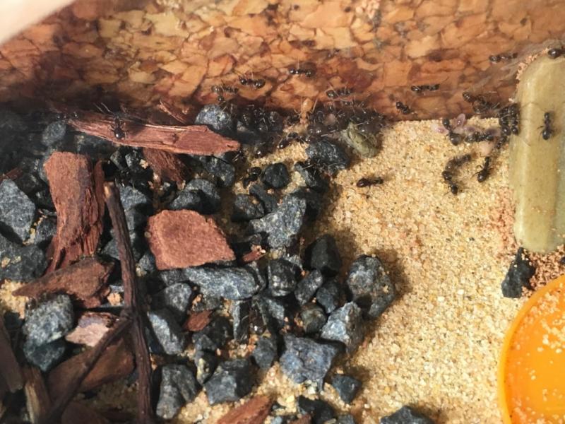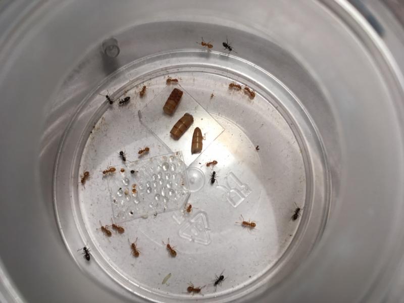 Rant... póki co się spisuje. Jedna robotnica pojawiła się na biurku podczas karmienia, ale nie wiem czy była na pokrywce z formi czy w resztkach mączników które leżały na tacce (sprawdzam pancerzyki przed wyjęciem czy coś w nich nie siedzi, ale pewności nie mam czy nie  przegapiłem).