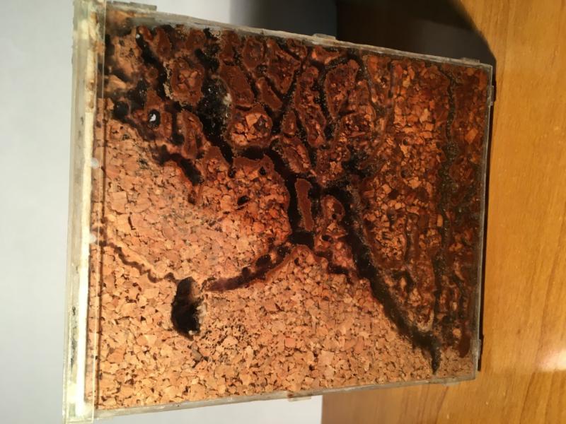 Formikarium. W formikarium zaczęły zachodzić pewne zmiany po tym jak podczas karmienia któryś raz z kolei około 10 robotnic znalazło się na ręce (wychodziły po pęsecie). Mianowicie postanowiłem przewiercić się przez ściankę aby można było podłączyć wężykiem dodatkową arenę. W tym celu: