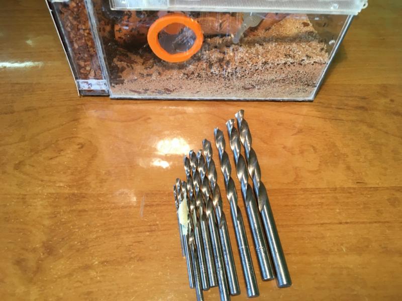 Zaczynając wiercić wiertłem od 1,5mm średnicy, aż do 6mm powoli powiększałem otwór o 0,5mm. Takie małe przeskoki by przypadkiem ścianka formikarium nie pękła czy też wiertło nie wyrwało dziury. Ostatecznie obeszło się bez strat materialnych: