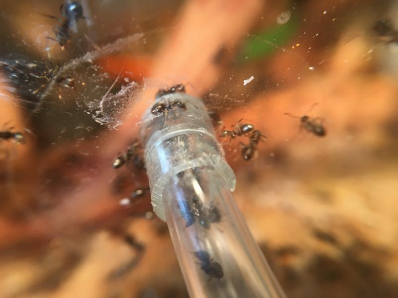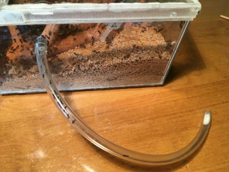 Skąd taka zmiana? Kolonia jest mała przez co robotnice niechętnie przechodziły przez wężyk, mam nadzieję że teraz będą lepiej dożywiać królową i larwy. Pomysł ten sprawdził się i L. flavus które rok temu miałem.