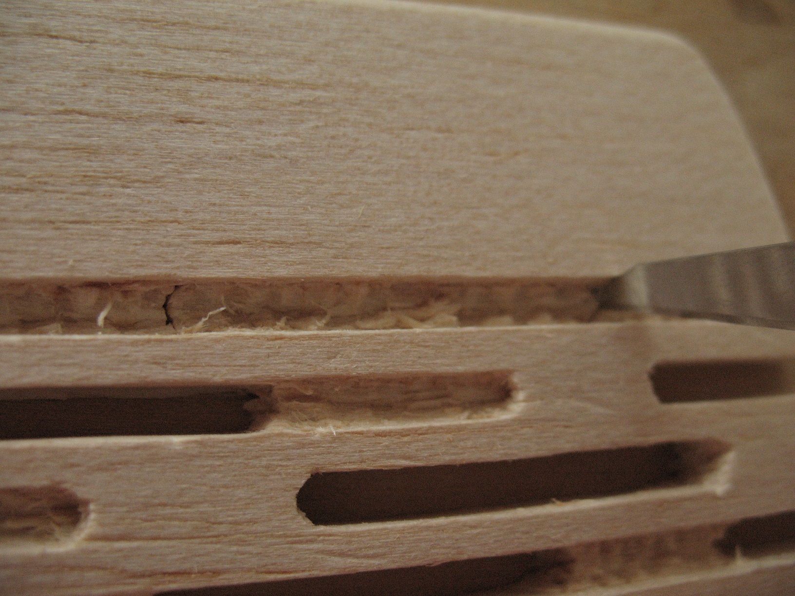 Wdawało mi się, że wszystko jest przemyślane i skrupulatnie zaplanowane, ale nie było. Już na samym początku popełniłem poważny błąd. Nie zmierzyłem jaką grubość będzie miało gniazdo z szybką. Okazało się, że po włożeniu do korytka pozostaje bardzo mało miejsca na pęcznienie drewna. Z wcześniejszych doświadczeń wiedziałem, że balsa łatwo pije wodę i mocno przy tym puchnie. Dlatego oszlifowałem dolną część szybki, żeby nie wchodziła do korytka.