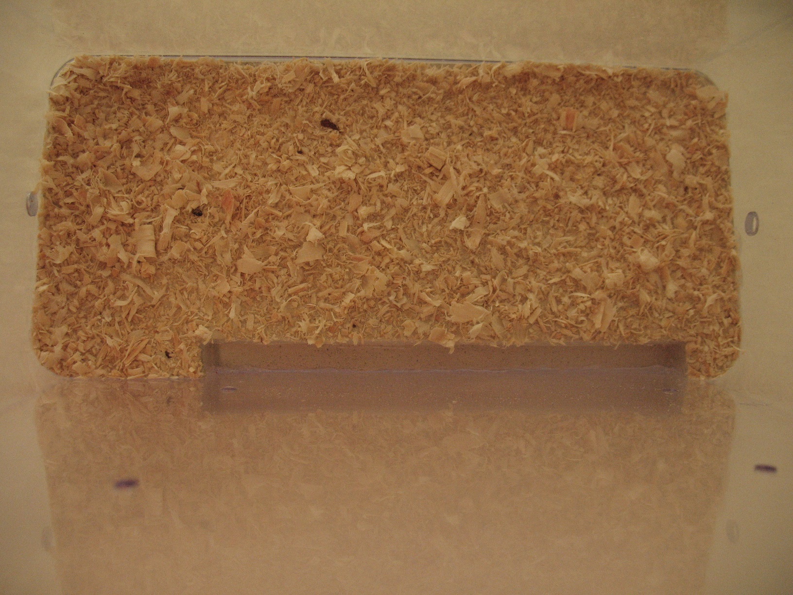 Trochę się obawiałem o wilgoć, że mrówki będą zgryzać trociny i upychać je do korytka. Woda się przesączy przez całą wyściółkę i zrobi się bagienko. Pomimo tego postanowiłem spróbować. Zakleiłem ścianki taśmą malarską i wysmarowałem gips klejem. Posypałem dokładnie trocinami i odkleiłem taśmę.
