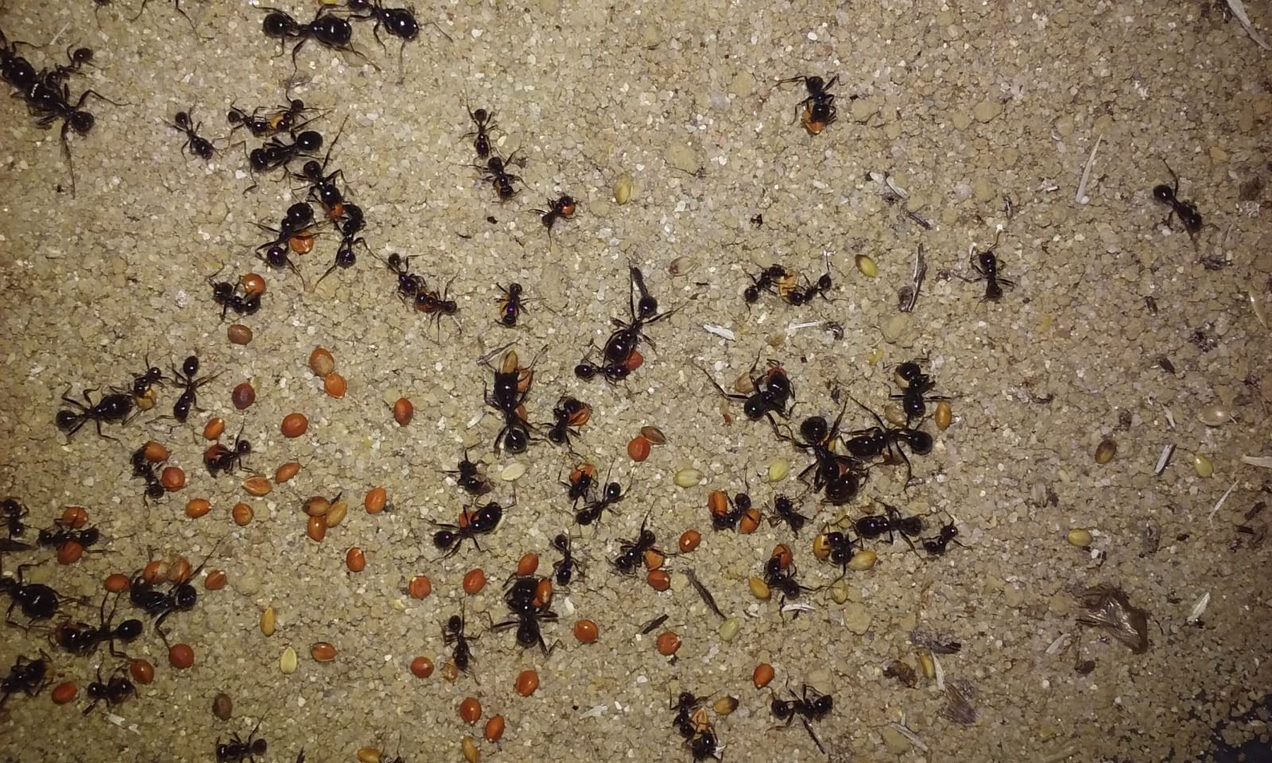 Już zapełniają spichlerze. Dałem je też innym koloniom jedzącym nasiona. Tetramorium, Pheidole i cieszą się sporym zainteresowaniem.