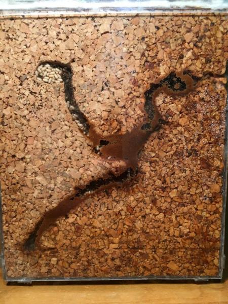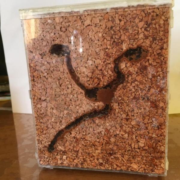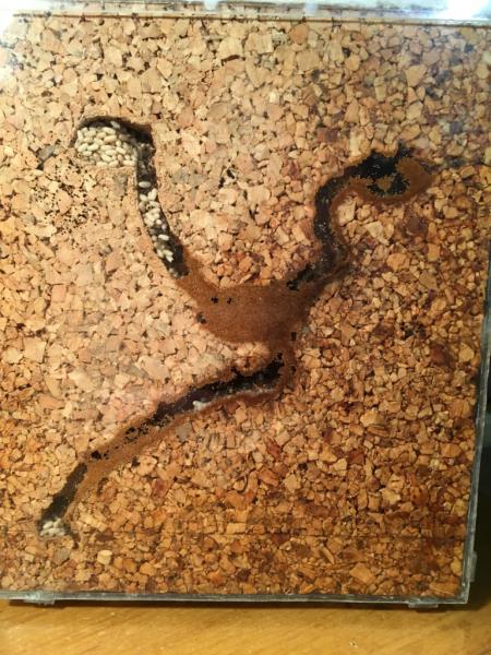 3.03.19 Przez ostatnie 1,5 dnia nawadniałem gniazdo, o godzinie 15:00 wyjąłem zatyczkę z gniazda i oświetliłem arenę lampką biurkową. Przeprowadzka trwała jakieś 3 godziny, ostatnie robotnice (około 10) nie zamierzały się ruszyć więc zostały wyeksmitowane siłą.