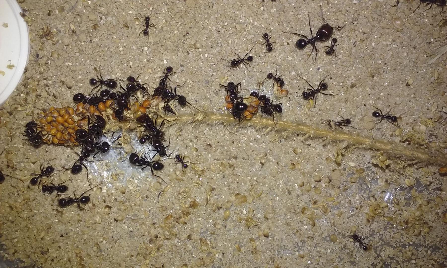 Jeśli chodzi o żywienie Messor, polecam zaopatrzyć się w kłosy prosa i od czasu do czasu wrzucić takiego kłosa mrówkom na arenę. Obserwowanie, jak samodzielnie łuskają nasiona albo odcinają całe grona i ciągną je do gniazda jest bardzo ciekawe. Moja kolonia licząca około 2 tys. robotnic ogołociła cały kłos w kilka godzin.