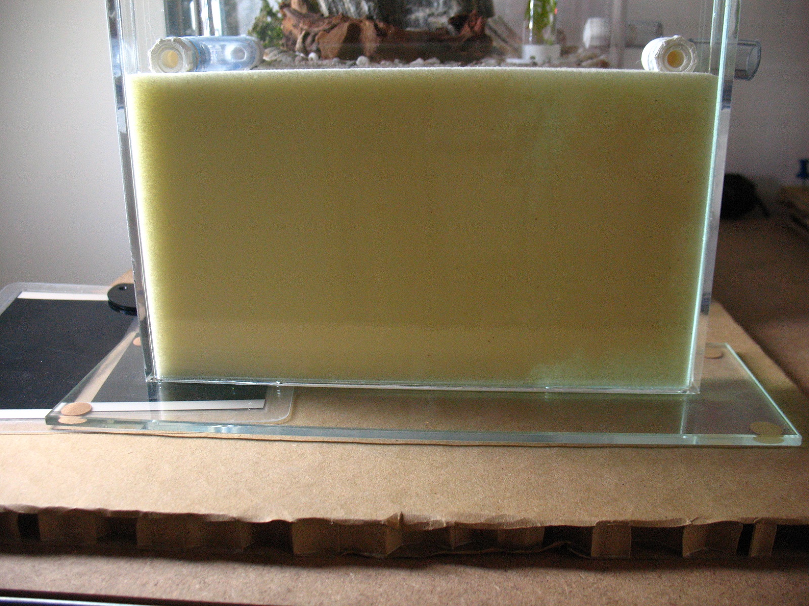 Najwięcej czasu zajęło mi ogarnięcie kanapki i wypełnienia. Zacząłem od wyboru gąbki florystycznej. Wszystkie suche gąbki się nie nadają, ponieważ nie chłoną wody. Wszystkie mokre gąbki rozsypują się w dłoniach i mają kolor cmentarnej zieleni. Po pewnym czasie grzebania w temacie trafiłem na produkt RAINBOW firmy OASIS, gąbkę łączącą cechy mokrej i suchej. Najbardziej zainteresowała mnie płyta w kolorze czekoladowym, niestety nie udało mi się jej dostać. Zależało mi na ciemnym kolorze który maskowałby pojawiającą się ewentualnie pleśń, ale zostały do wyboru kolory sportowych samochodów i kremowy. Znalazłem sklep internetowy sprzedając płyty w kolorze kremowym po 3 sztuki w paczce. Zbyt dużo gąbki za zbyt dużo pieniędzy. Zdecydowałem się na kupienie jednej kostki OASIS Rainbow Ivory w kolorze kremowym, o wymiarach 23x11x8cm. Te wymiary zdeterminowały wielkość kanapki. Żeby nie pisać o szklarzach napiszę o szkle. Płaszczyzny muszą być spasowane bardzo dokładnie, niedociągnięcia niewidoczne na pierwszy rzut oka zaczynają stanowić duży problem podczas montowania wkładu. W niedokładnie sklejonym gnieździe gąbka albo będzie odstawać od którejś z szyb albo zniszczy się podczas wkładania. Jej wytrzymałość jest większa od standardowej mokrej gąbki florystycznej, nie kruszy się od samego patrzenia, ale to wciąż gąbka florystyczna, trzeba obchodzić się z nią bardzo delikatnie. Przygotowanie wkładu zacząłem od  ucięcia plastra. Zmontowałem ramkę z kantówki grubości 10mm bo tyle wynosiła grubość złoża w gnieździe i podłożyłem pod spód kartonik żeby uzyskać dodatkowy milimetr. Z założenia wkład miał wchodzić na lekki wcisk. Plaster planowałem uciąć nożem, ale pomimo szczerych chęci okazał się zbyt krótki, kolejnym narzędziem w toolboxie był młotek, dlatego wziąłem brzeszczot. Jedną ręką dociskałem gąbkę od góry natomiast pozostałymi dwoma prowadziłem brzeszczot po ramce. Ciąć trzeba spokojnie, dużo piłować mało cisnąć . Z całej kostki ostatecznie, po wszystkich cięciach i szlifowaniach, udało mi się pozyskać jeden doskonały wkład. Po wycięciu plastra dociąłem nożem jeden z boków do długości 20cm, trzeci wymiar stanowiący w tym przypadku wysokość ( 11cm) pozostał bez zmian. Nadmiar jednego milimetra na grubości to zdecydowanie za dużo, podczas próby wciśnięcia taki wkład rozpada się w rękach z powodu zbyt dużych oporów ale szlifowanie papierem ściernym pozwala dokładnie go dopasować. Dodatkowo szlifowanie wyrównuje wszystkie rysy powstałe przy cięciu. Ewentualnym problemem może być to, że momentami szlifuje się zbyt łatwo, jeden ruch za dużo i wkład wpada luźno w kanapkę. Wkład najlepiej przygotować raz a dobrze, jak już go wciśniemy do połowy i okaże się, że coś jest nie tak to raczej w jednym kawałku nie uda się go wyjąć. Ale nawet dobrze spasowany stwarza problemy. Jak już wcześniej pisałem chciałem, żeby wypełnienie nie latało luźno, było wklinowane pomiędzy szyby dlatego były opory, na początku na tyle małe, że można było dociskać ręką, ale po włożeniu jednej  trzeciej poczułem, że zaraz na gąbce zostaną doły po palcach. W takim momencie gąbka powinna być dociskana równo na całej powierzchni. Ja wykorzystałem do tego zbyt mocno wyszlifowany wkład który wchodził w gniazdo z lekkim luzem i to było chyba najlepsze rozwiązanie. Siły rozłożyły się na obu gąbkach tak, że gdy wkład osiągną dna jego górna krawędź była równiusieńka.