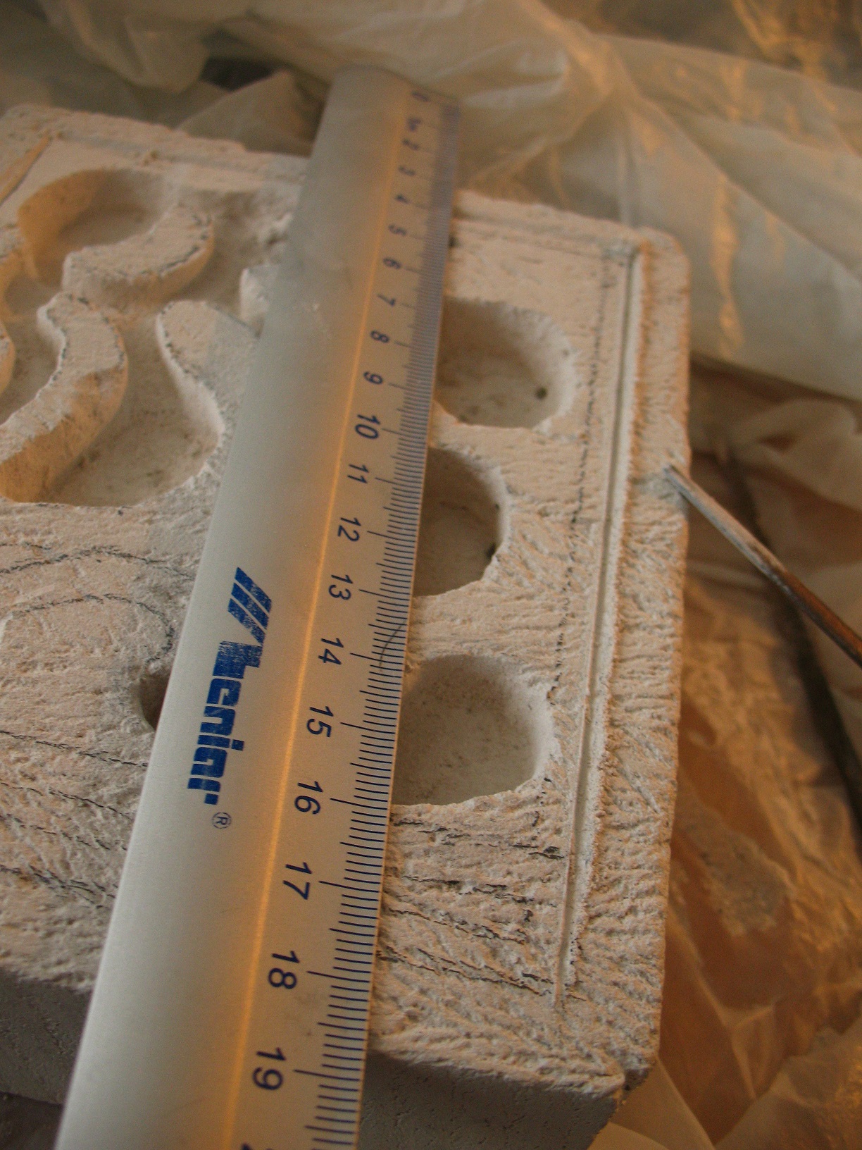 Pozostały obszar potraktowałem jako mój obszar roboczy i zacząłem projektowanie komór, w międzyczasie wcisnąłem jeszcze jedną komorę  nawadniającą. Rysunek przeniosłem na wcześniej wycięty beton nanosząc najistotniejsze punkty za pomocą linijki. Oczywiście w ferworze się pomyliłem i musiałem całość „ścieśnić” dla tego przypomnę jedno z powiedzeń Paulo Coelho: „Mierz dwa razy, tnij raz”  Smile Do cięcia użyłem najtańszej piły do drewna, poszło bardzo sprawnie. Z racji późnej pory dnia rzeźbienie komór zacząłem robić ręcznie wiercąc i skrobiąc końcówkami pilników. Żmudna i Trzebiaowska to praca, ale da się ją wykonać . Młotek i śrubokręt odpuściłem z powodu małej dokładności. Gdy przyszedł czas na mechaniczne narzędzia zaznaczyłem na wiertle 12mm (2mm na zagłębienie pod plexi i 10mm na komory) i zacząłem rozwiercać zostawiając bezpieczny odstęp od linii.