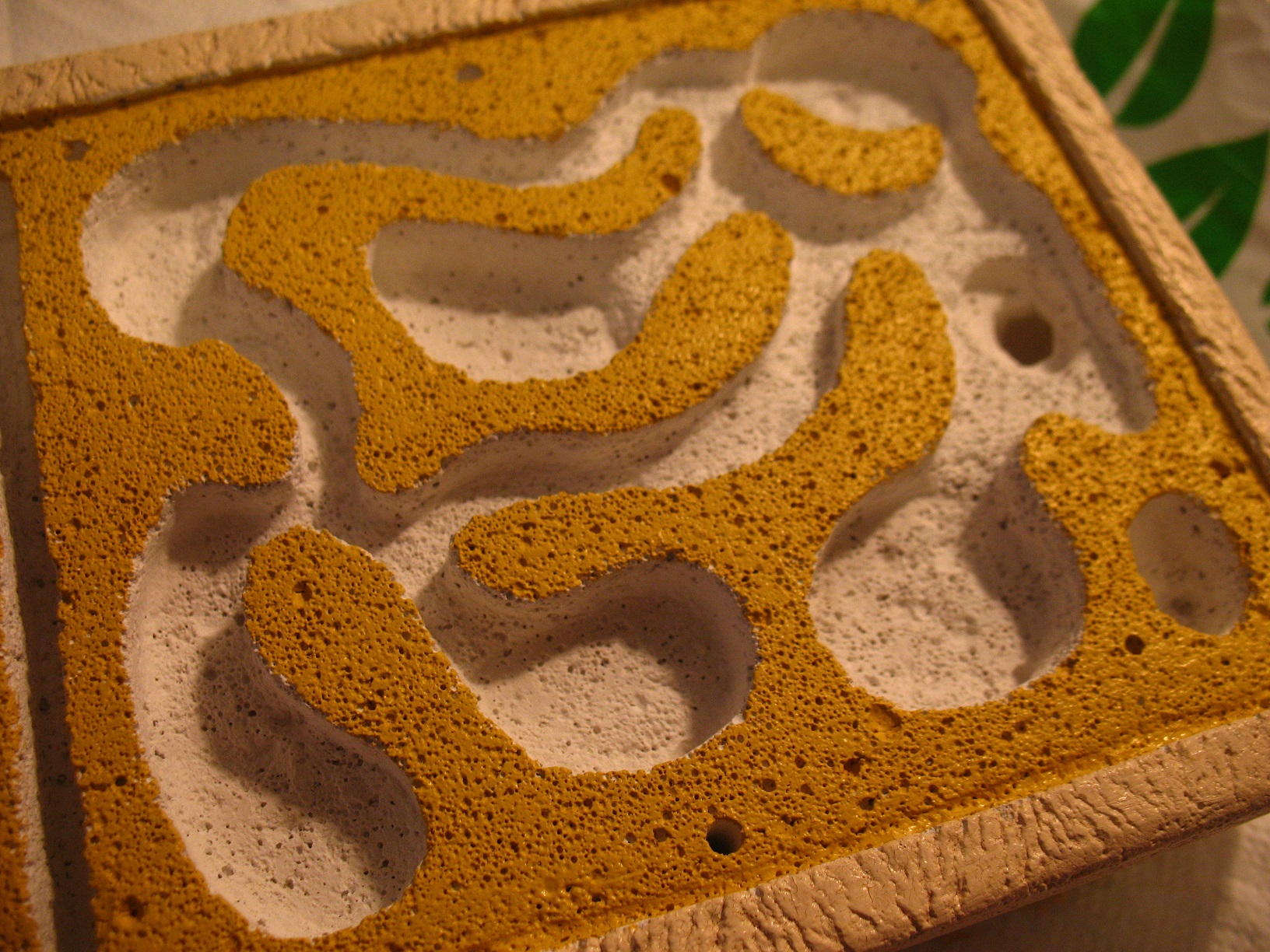 Kolor waniliowy i modowy, sugerowałem się wyglądem, nie smakiem. Poczekałem 4 dni żeby farba dobrze wyschła. Nauczony błędami, w tym gnieździe umieściłem medium trzymające wodę, przepłukaną gąbkę do naczyń. Plexi przykręciłem wkrętami do drewna, bo lepiej pasowały kolorem. Jeszcze tylko podkładki i gotowe.