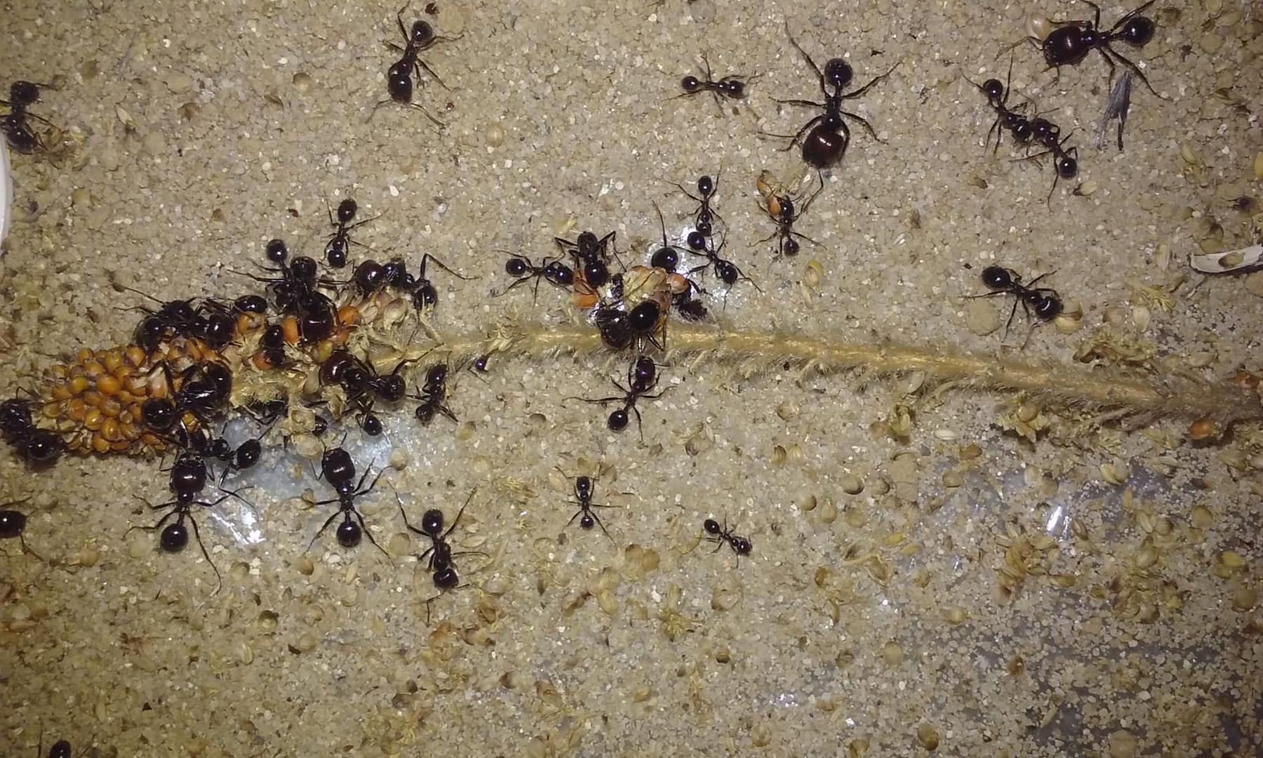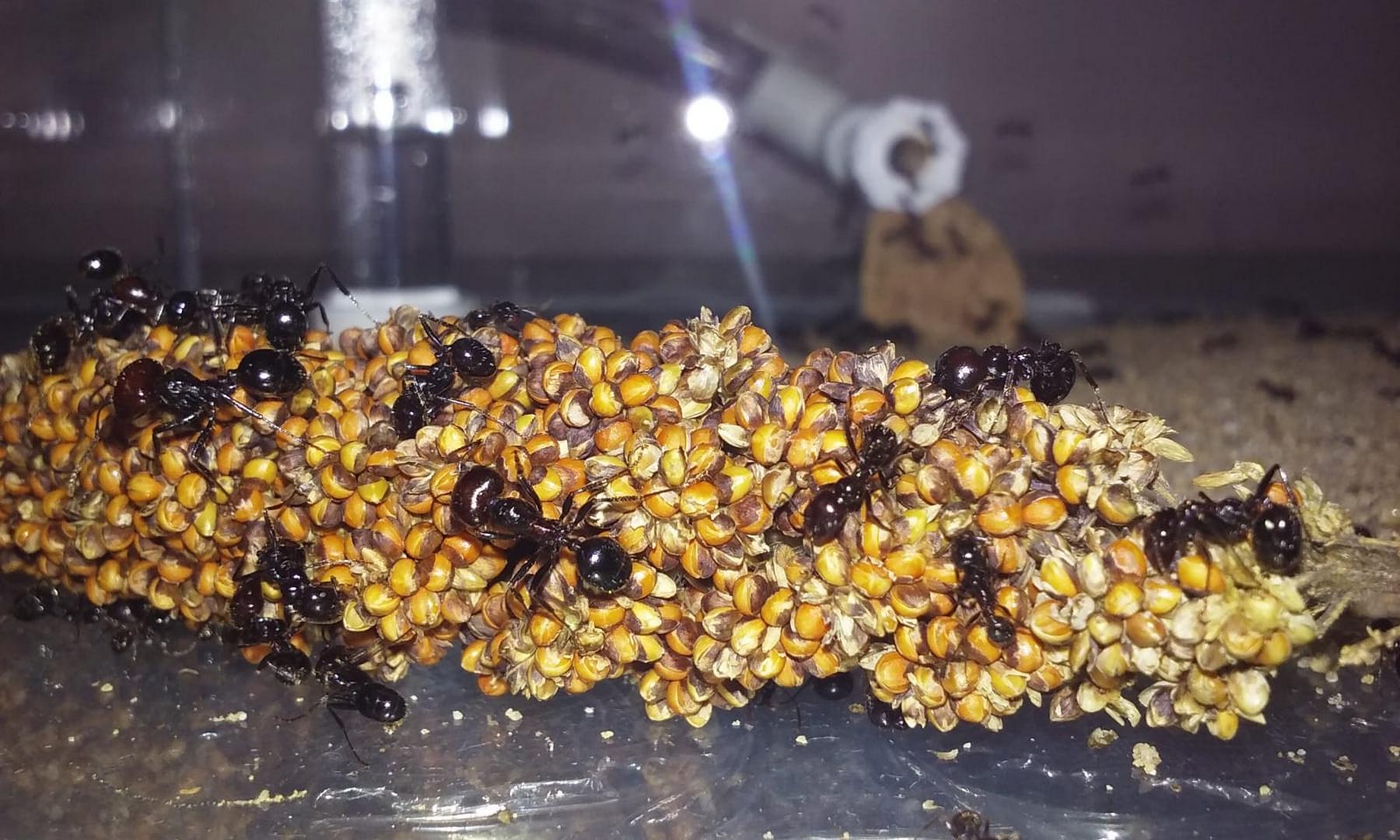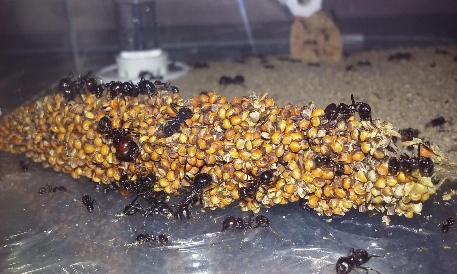 Jeśli chodzi o żywienie Messor, polecam zaopatrzyć się w kłosy prosa i od czasu do czasu wrzucić takiego kłosa mrówkom na arenę. Obserwowanie, jak samodzielnie łuskają nasiona albo odcinają całe grona i ciągną je do gniazda jest bardzo ciekawe. Moja kolonia licząca około 2 tys. robotnic ogołociła cały kłos w kilka godzin.