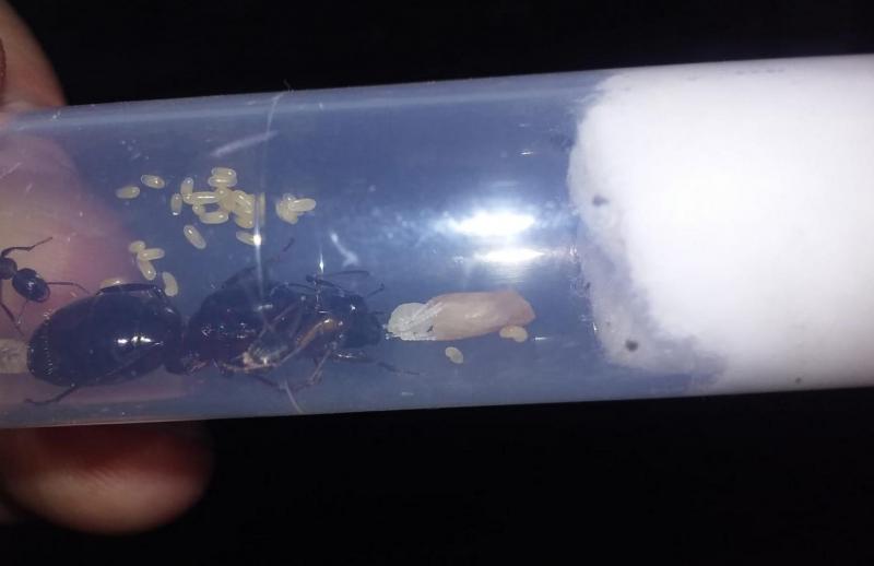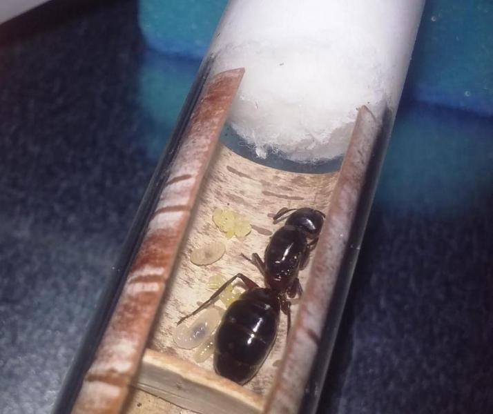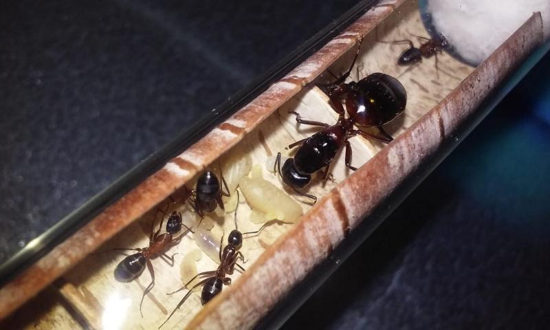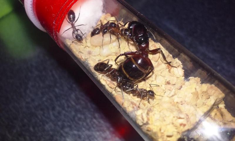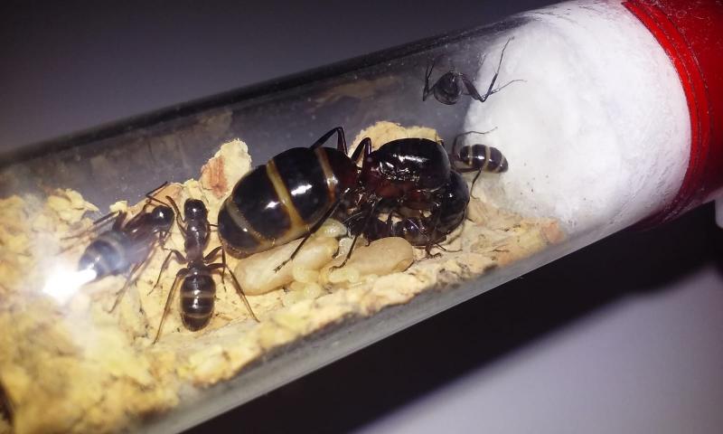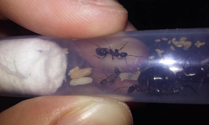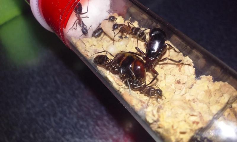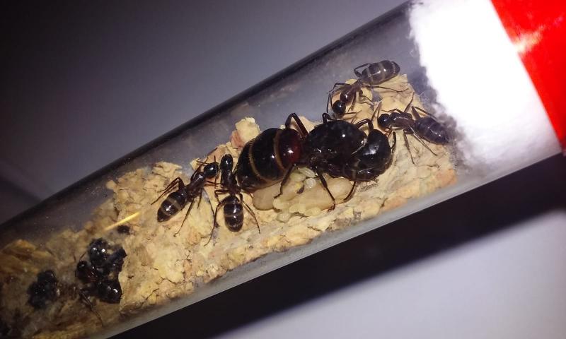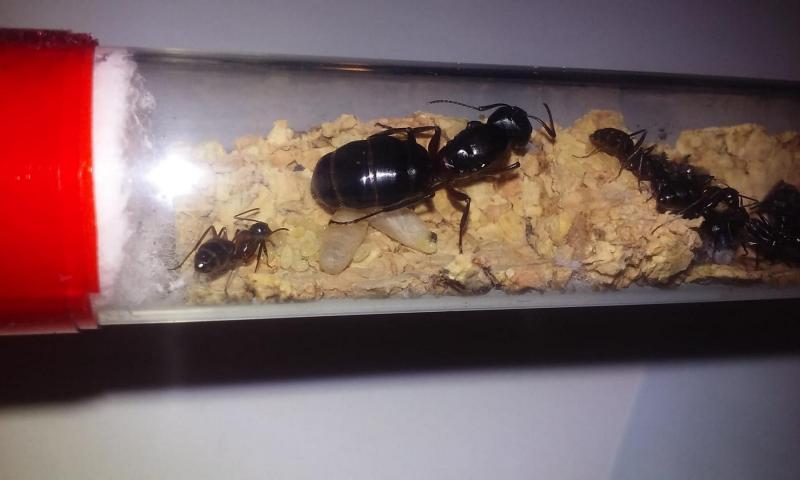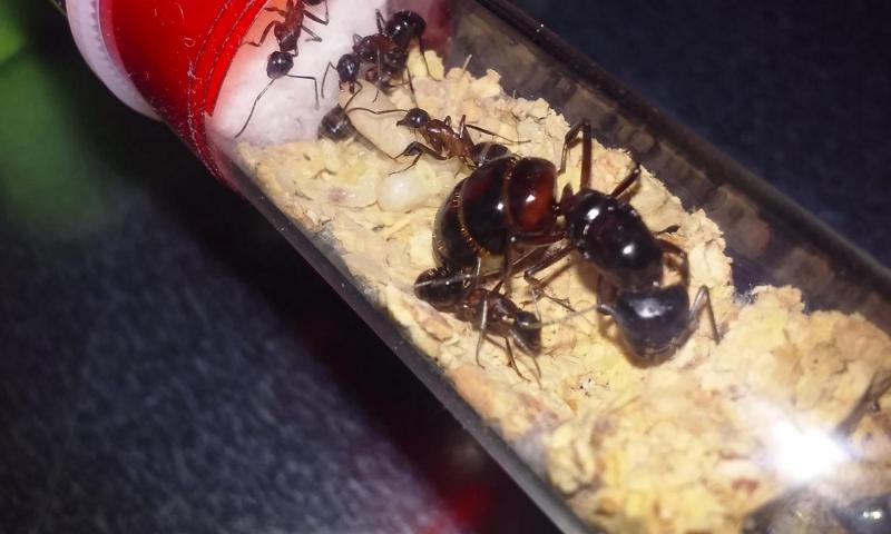 Trochę pomogłem królowej w większej kolonii tak, by po chwili znalazła się w probówce razem z córkami i potomstwem. Z czasem na świat przyszła szósta robotnica. W mniejszej kolonii z przedwcześnie otwartej poczwarki także rozwinęła się kolejna mrówka.