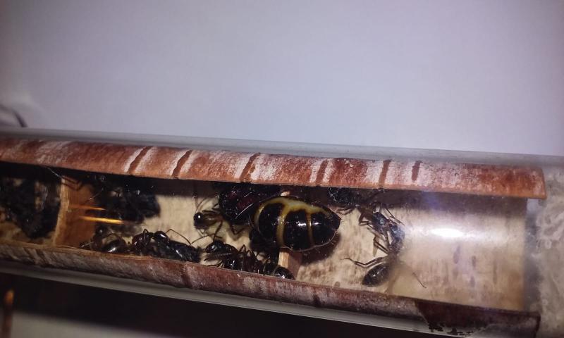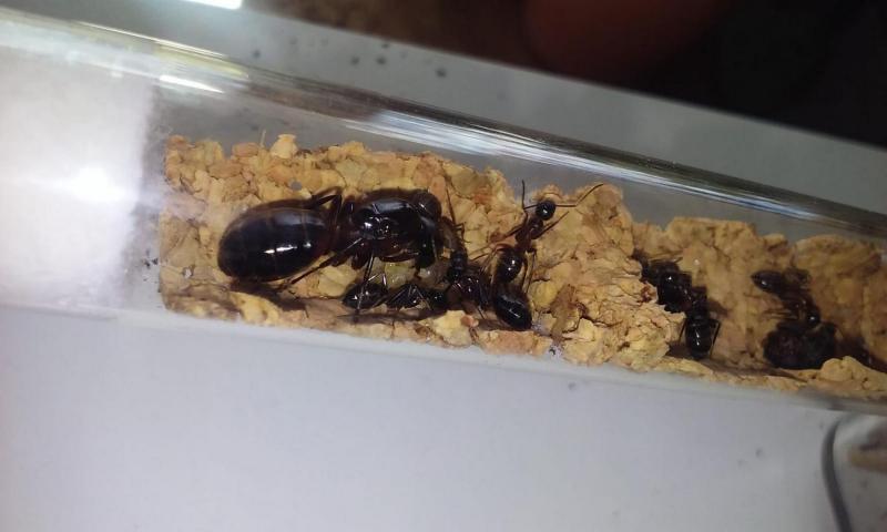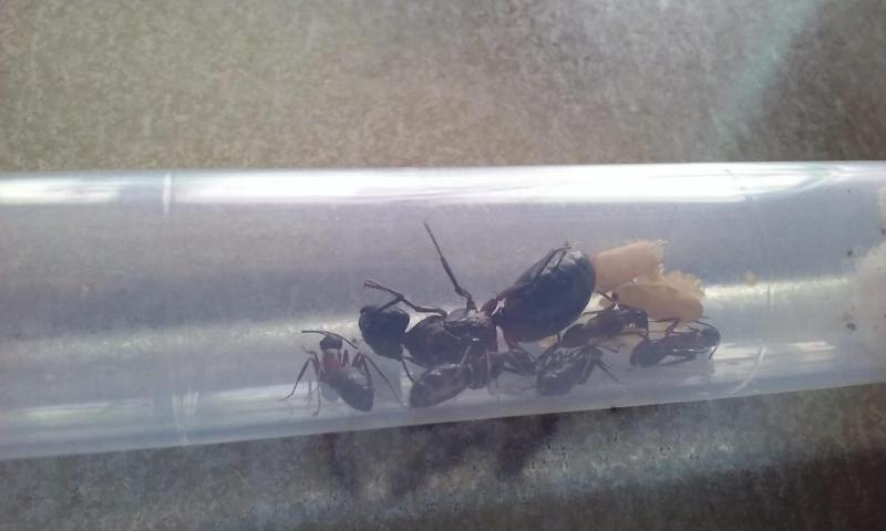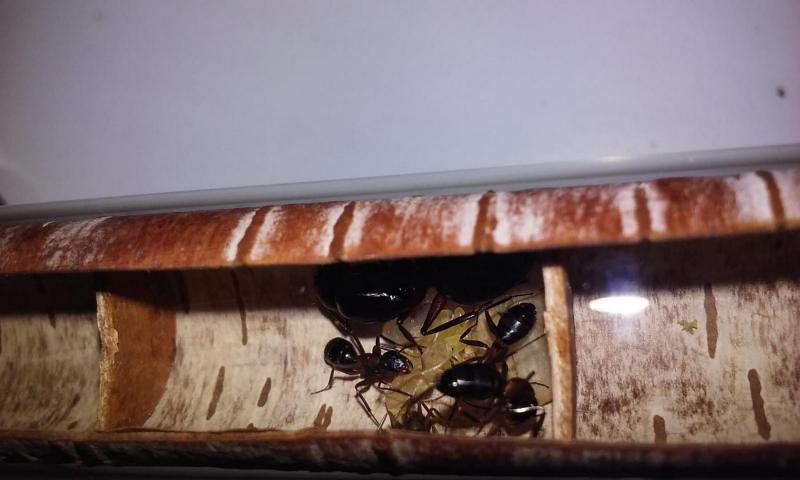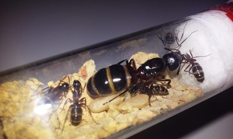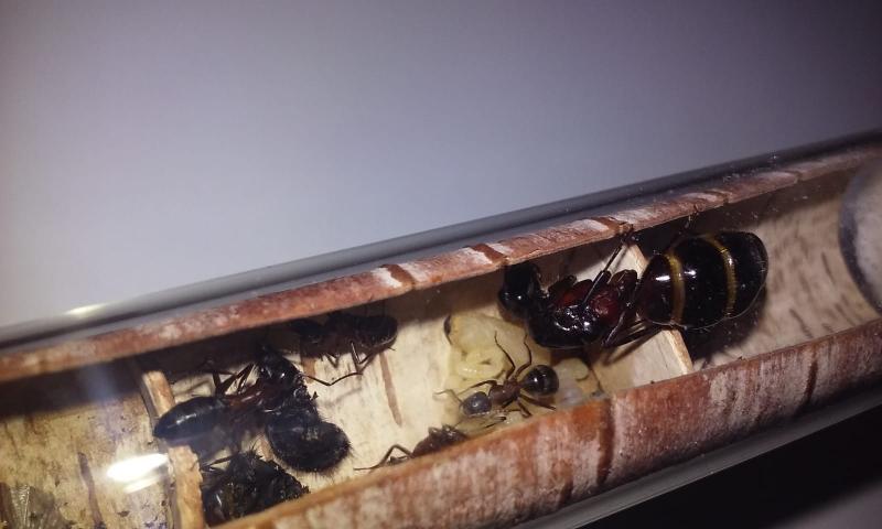 Większa i mniej ruchliwa królowa ma się dobrze. Obie kolonie chętnie przyjmują pokarm białkowy - muchy, małe karaczany tureckie, a nawet kawałki świerszczy. Piją też dużo miodu.