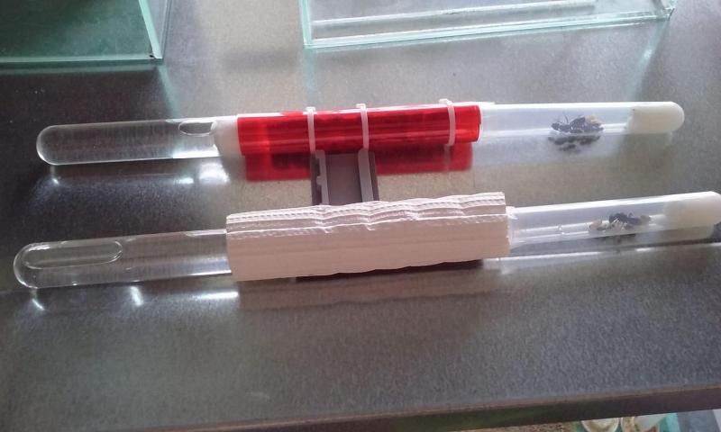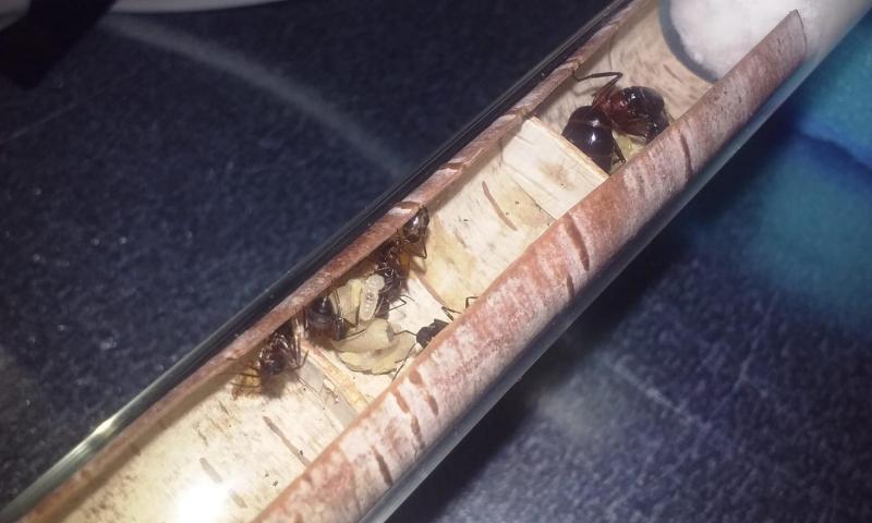 Zainspirowany pomysłami Huberta, probówkę dla mniejszej kolonii wyścieliłem korą brzozy, a probówkę dla większej kolonii wyścieliłem korkiem.