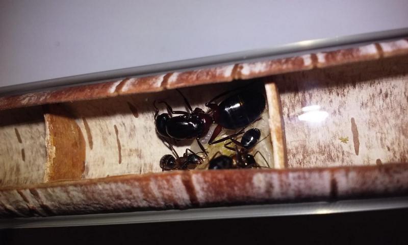Dawno nie zaglądałem do obu kolonii, przez co teraz pozytywnie się zaskoczyłem. W kolonii brzozowej przybyło aż pięć robotnic. Tym samym kolonia brzozowa prześcignęła kolonię korkową, w której jest ich teraz siedem. Obu królowym jeszcze bardziej powiększyły się odwłoki. W kolonii brzozowej pierwszy raz widziałem na arenie więcej niż jedną robotnicę. Obie kolonie wciąż żywią się głównie muchami. Czasem dla urozmaicenia podaję im też maleńkie karaczany tureckie, ale te nie cieszą się wielkim zainteresowaniem.