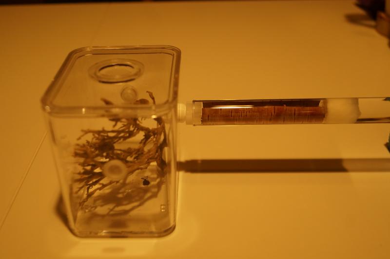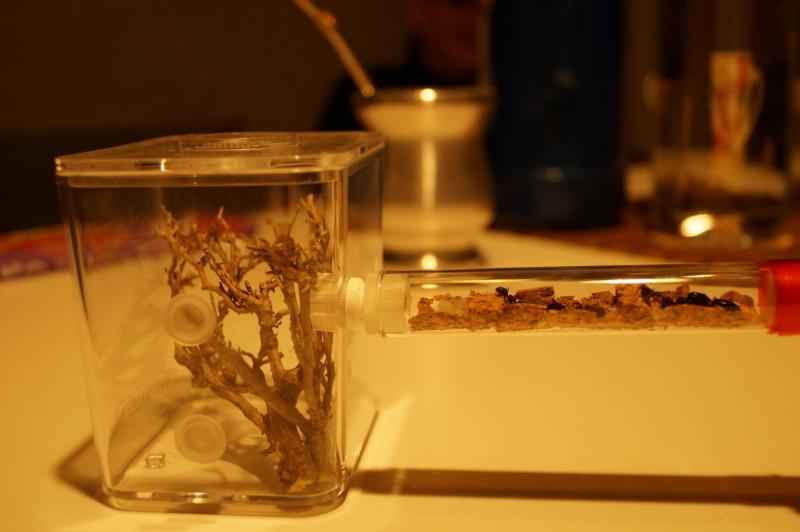 Już następnego dnia po przeprowadzce, każda z kolonii dostała po małej arence wykonanej ze słynnych pojemników z pewnego szwedzkiego sklepu. Przez ostatnie 10 dni w obu koloniach codziennie widuję przynajmniej jedną robotnicę na arenie. Do środka wrzuciłem gałązki wrzośca. i połączyłem probówki z arenkami. Okazało się, że z zatyczek do plastikowych probówek, których sporo mam w domu, w łatwy sposób można zrobić bardzo wygodne konektory do szklanych probówek i to zarówno do szesnastek jak i dwudziestek. Ale o tym innym razem, w innym wpisie.