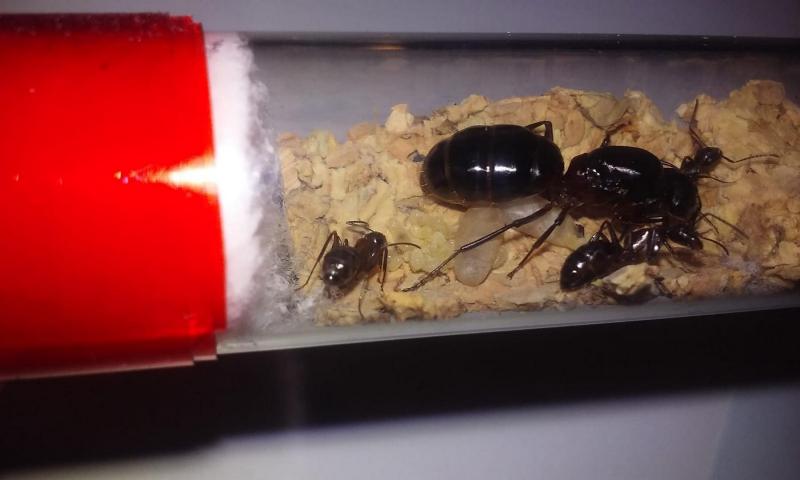 Większa kolonia przeniosła się jeszcze tego samego dnia, ale bez królowej. Ta została w probówce, w której mrówki do mnie dotarły i wcale nie wyglądało na to, że miała się przenieść. Znów zaczęła polegiwać na boku.