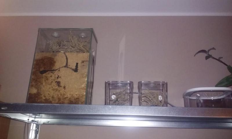 Ponieważ na regale, który zajmują mrówki przygotowuję miejsce na kolejne formikaria, obie kolonie przeniosłem na najwyższą półkę, obok czterokropka.