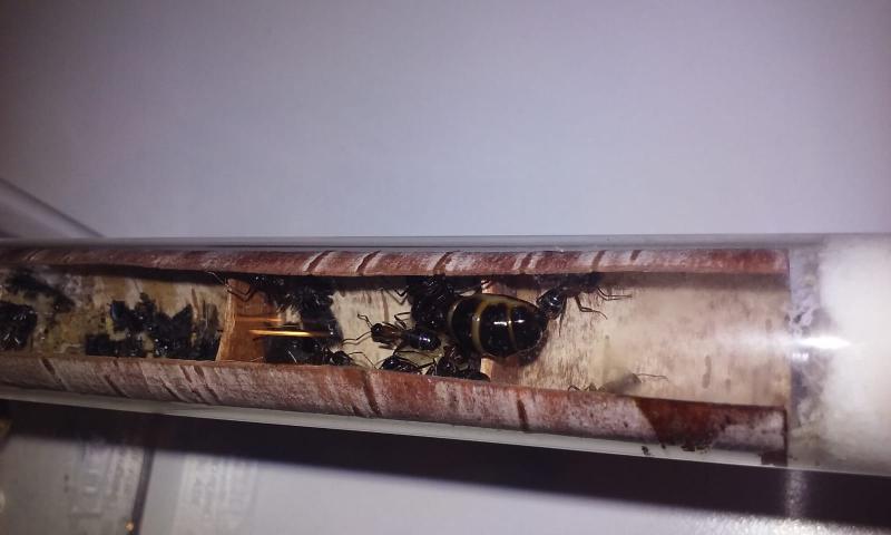 Być może to przez jej duże rozmiary i mało miejsca w probówce. Między królowymi jest widoczna na pierwszy rzut oka różnica w rozmiarach, ale też w zachowaniu - mniejsza królowa jest dużo bardziej ruchliwa.