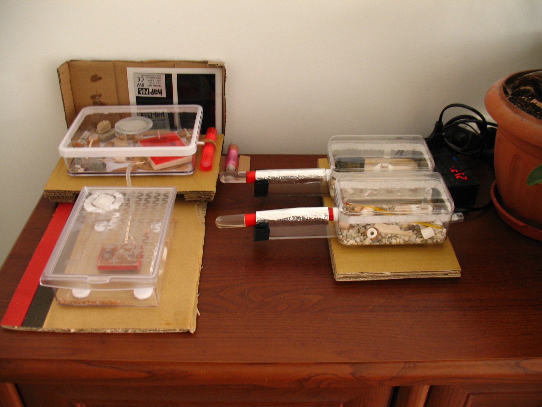 Szybkę wyciąłem z plexi po ferrero i idealnie wyszlifowałem do krawędzi łupiny, wszystko wyglądało bajecznie Smile (niestety nie mam foto). Zalałem sznurek wodą, wilgoć pięknie rozeszła się po części gniazda. Już widziałem szczęśliwą mrówczą rodzinę w swoim nowym domku…. I orzech pękł. Pękł drugi i trzeci. W sumie to na początku mogłem to sprawdzić, ale kto by pomyślał Wink