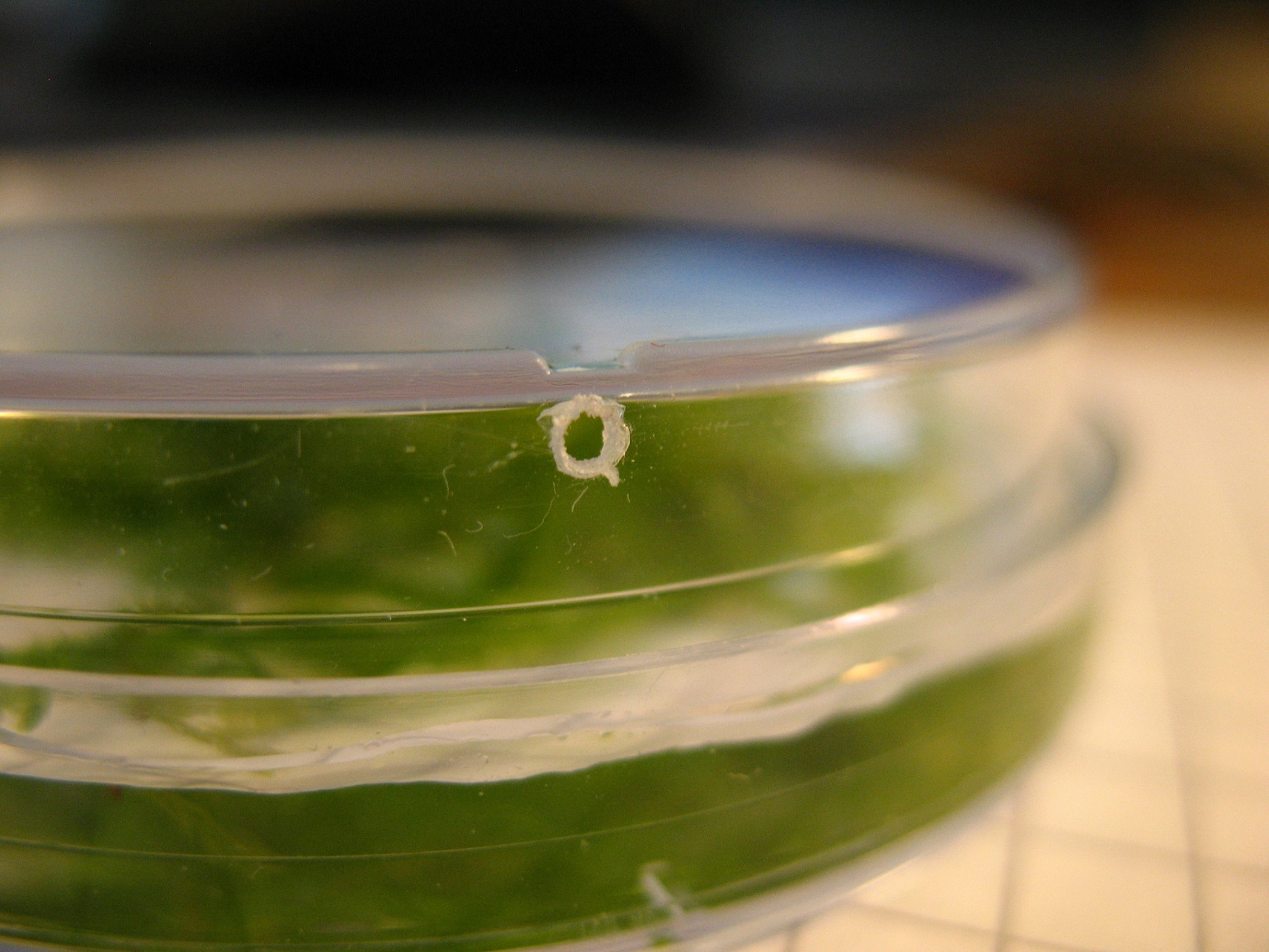 Plastikowa szalka Petriego ok.50mm z otworami wentylacyjnymi. Takie 3 bruzdy dzięki którym między dwoma częściami szalki powstaje mała szczelina. Większa część to nasza podstawka, mniejsza to wieczko. W wieczku robimy mały otworek przez który będzie uciekać powietrze podczas dolewania wody, dzięki temu cała szalka będzie mogła napełnić się wodą.