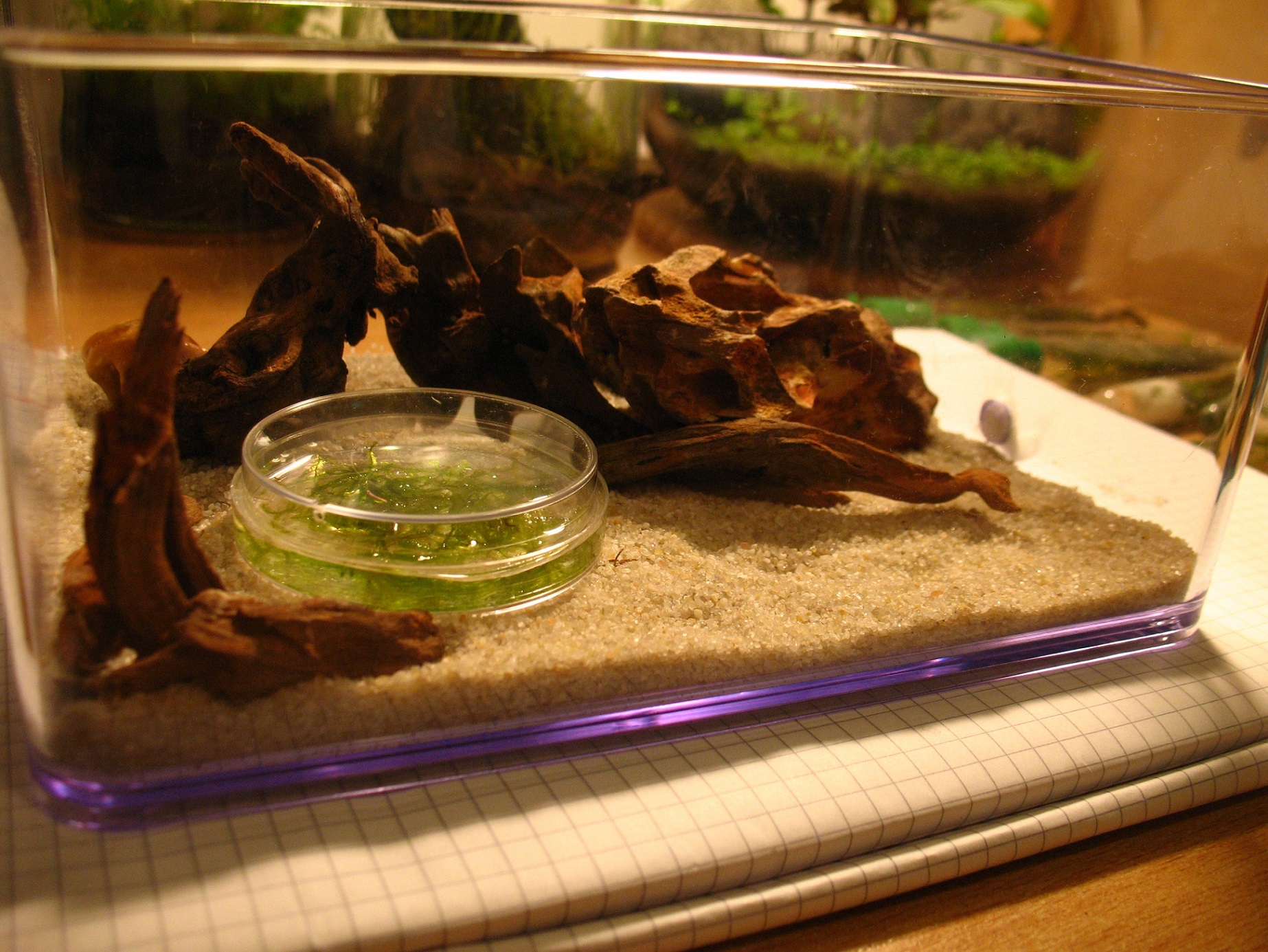 Przy szalce bez otworów wentylacyjnych i dziurki piasek dodatkowo podsiąka i gromadzi wodę wewnątrz szakli. Zalecam wystój pochodzenia mineralnego przepłukany wrzątkiem, odradzam stosowania rzeczy organicznych: części roślin, korzenie. Raz w tygodniu roślinę wyciągamy i płuczemy w odstanej wodzie, szalkę czyścimy wacikiem pod bieżącą wodą, wystrój ja osobiście wymieniam nie bawię się w płukanie. Przycinać nożyczkami lub rozrywać. Najlepiej stosować rośliny kupione w akwarystycznym i przez internet lub od znajomych z ustabilizowanym akwarium. Wtedy mamy pewność, że na roślinie nie będzie żadnych szkodliwych mikrobów i pasożytów. Rośliny kupione w żelu trzeba z niego dokładnie wypłukać. Jeżeli arena jest w bardzo zacienionym miejscu to Mech jawajski można doświetlać zwykłą lampką biurkową z żarówką led przez kilka godzin dziennie. W przypadku utrudnień z pielęgnacją np. wyjazd, mech można przełożyć do większego naczynia z wodą lub do probówki zatkanej korkiem z odrobiną wody. Proste poidełko dla mrówek z ładną rośliną która dodatkowo oczyszcza wodę dla naszych podopiecznych z toksyn. Poidełko zalecam dla większych mrówek np. Camponotus, Formica, szczelina ma ponad 1mm, małe mrówki mogą się potopić.