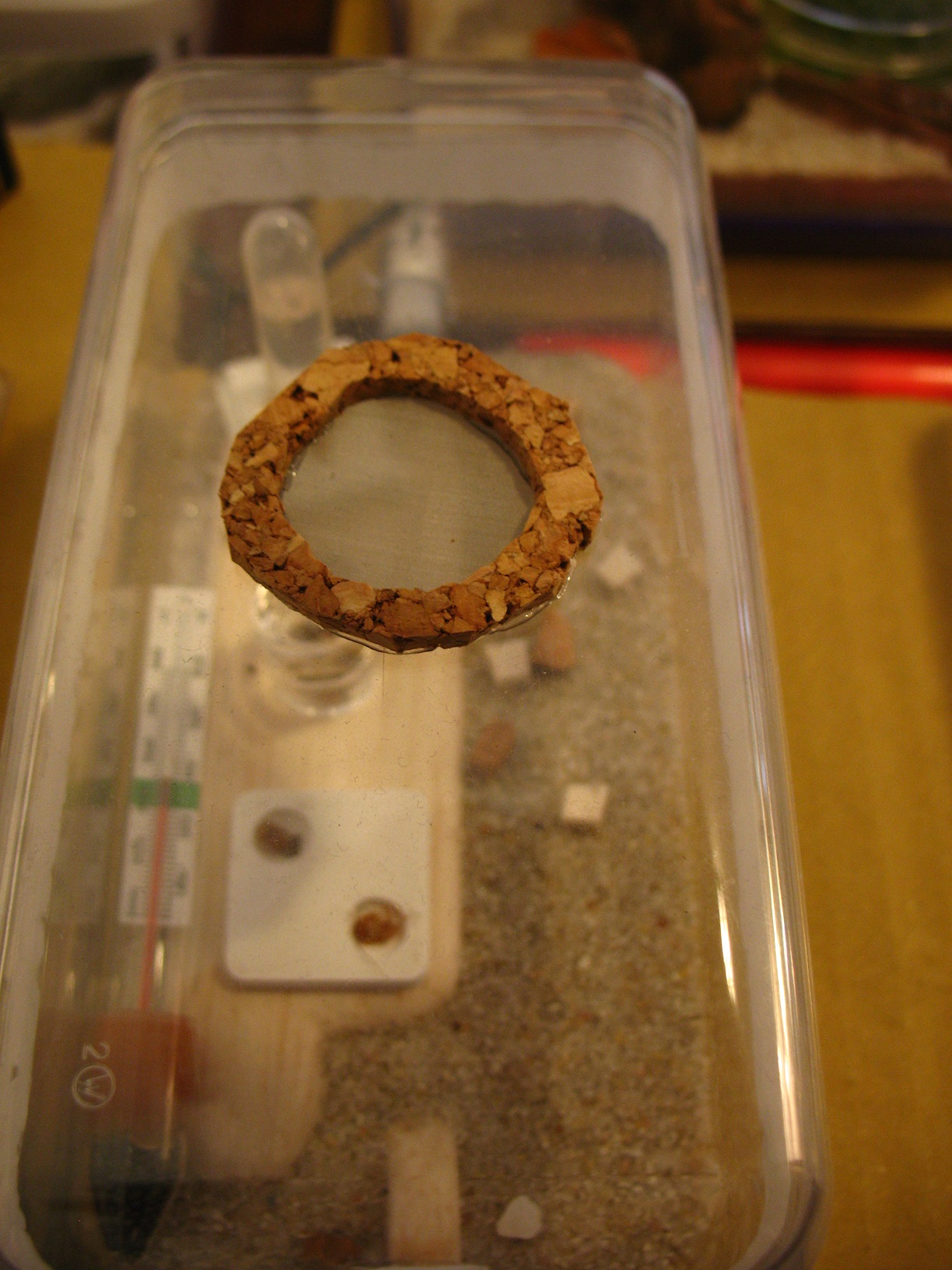 W tym korku, zgadnijcie którym, gniazduje mała kolonia Temnothorax sp. Jeżeli chcesz trzymać te mrówki na arenie innych mrówek i nie chcesz robić im gniazda, wstaw korek z gąsiora. Niemielony, z naturalnymi szczelinami. Kilka kropli wody w jedną ze szczelin co kilka dni im wystarczy.
