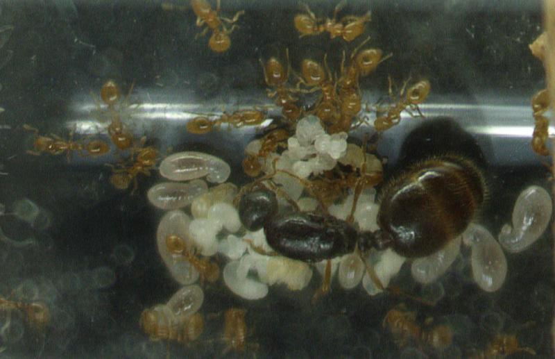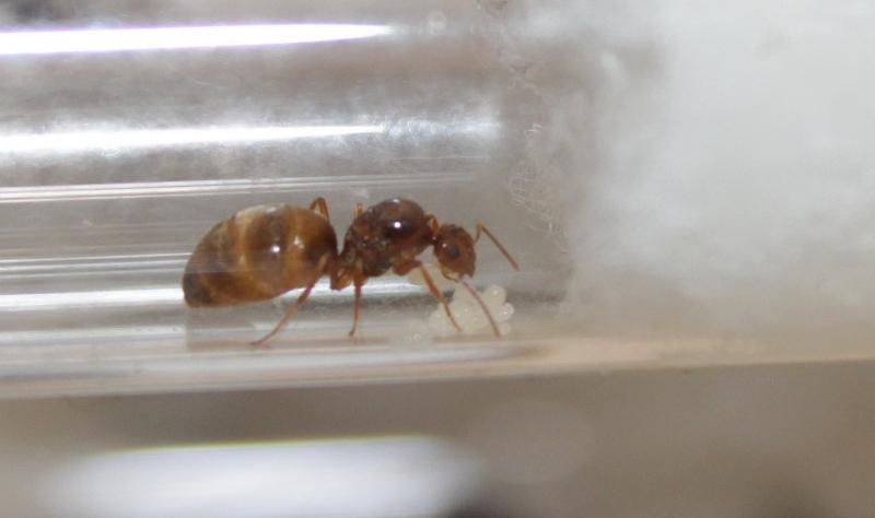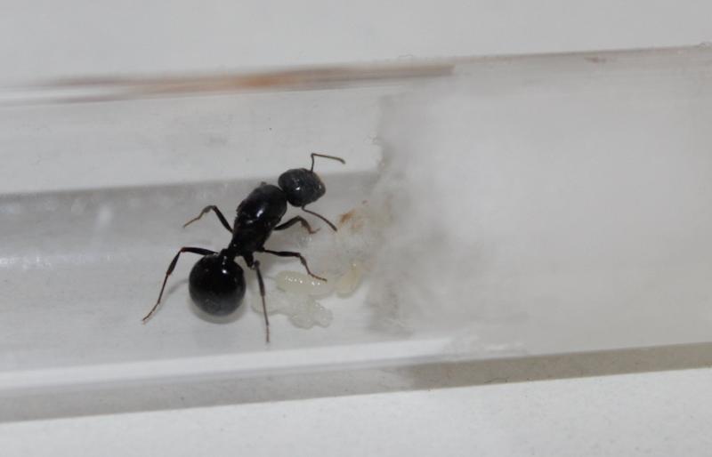 Ten gatunek otwiera grupkę trzech o nietypowych sposobach rozmnażania. Miałem już moment, w którym straciłem wobec tej kolonii nadzieję, bo po tym, jak do mnie trafiła, znalazłem w fiolce trochę martwych mrówek. Liczyłem, że nie ma wśród nich gamergaty, ale potomstwa nie było i nie było... Na szczęście ostatnio zauważyłem piękną porcję jaj - liczę, że pochodzą od gamergaty. Zdjęcia tylko spoza gniazda, bo nie chcę ich zachęcać, by w stresie zjadły te larwy, które już mają.