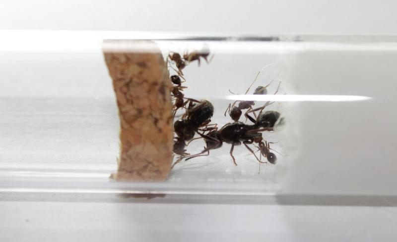 Często można spotkać się z opiniami, że Formica s.str. zagazowują się w sztucznych gniazdach kwasem mrówkowym. Z moich doświadczeń na razie wynika, że robotnice wyklute w naturze - owszem. Te, wyklute w niewoli zachowują się - przynajmniej na razie - dość grzecznie. Można machać im ręką przed gniazdem i nie reagują na to. Są za to bardzo wrażliwe na drgania. Cała ich rezydencja stoi na półce przykręconej do ściany i są tam tylko one. Nie wyobrażam sobie trzymania tych mrówek na regale, biurku, czy innym meblu, które narażone jest na jakiekolwiek drgania. Tutaj panika przy najmniejszym drganiu jest dużo większa, niż przy jakimkolwiek innym gatunku, z którym miałem okazję mieć do czynienia. Na szczęście nie tryskają przy tym kwasem. Na wszelki wypadek szklane przykrywki do gniazd leżą na szpilkach entomologicznych, przez co jest tam szparka na jakieś pół milimetra - daje to jakąś możliwość wentylacji, gdyby postanowiły użyć kwasu w gnieździe.