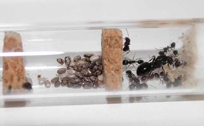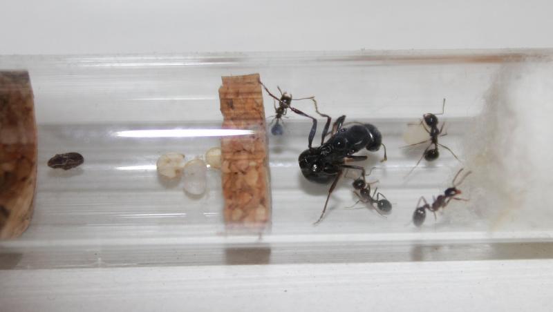 W związku z tym królowa otrzymała około 50 robotnic i 250 poczwarek tego gatunku. Na samym początku trzymałem taką ekipę w gnieździe 3d wielkości 9x9 cm, połączonym z niewielką areną. W momencie, kiedy z kokonów wyszły wszystkie robotnice F. cunicularia, podłączyłem je do docelowego lokum. Przy przeprowadzce zauważyłem, że solidnie odkarmiona przez robotnice królowa zdążyła złożyć już całkiem solidny pakiet jaj.