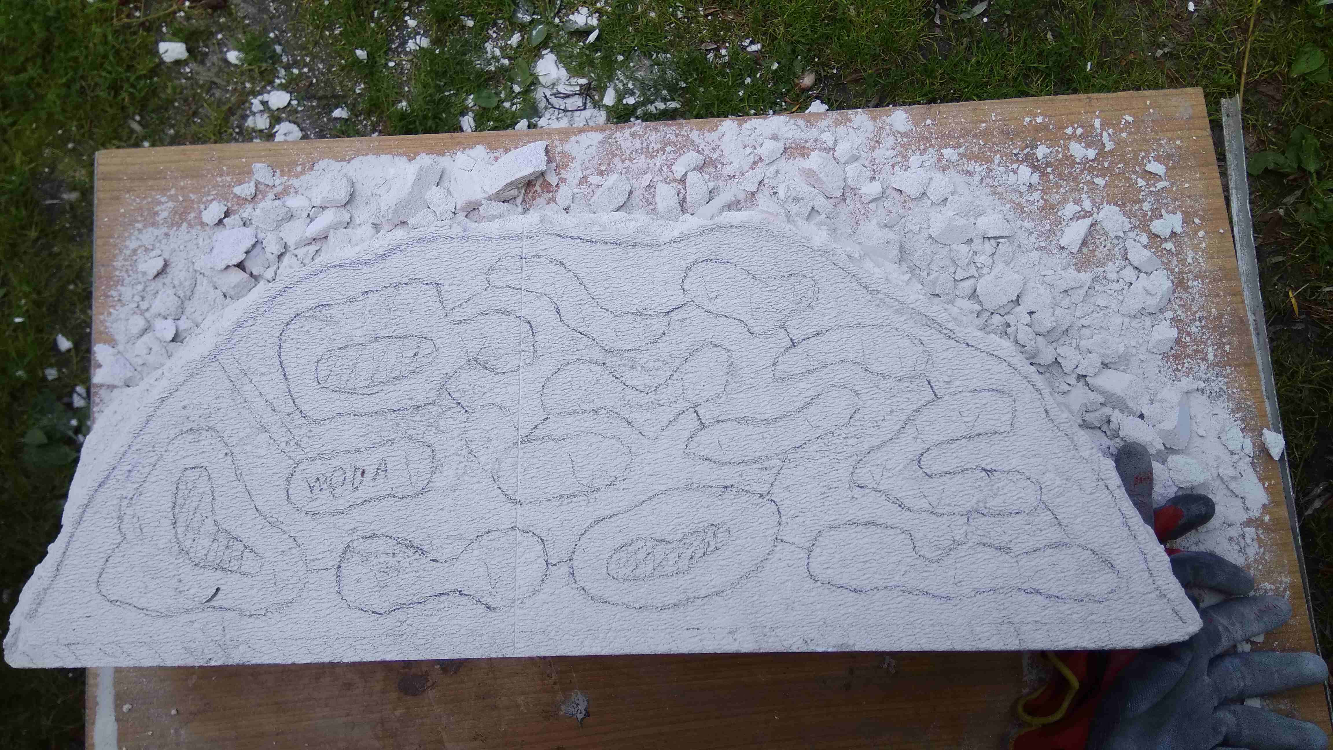 Tutaj nie ma żadnej magii, wybrałem bloczek, rozrysowałem pierwsze komory i ogólny zarys po czym zacząłem dłubać. Generalnie nie używałem narzędzi, robiłem to za pomocą dłuta, śrubokrętów, młotka i odrobiny papieru ściernego aby je nieco wygładzić. Sam proces wymagał jedynie odrobiny czasu i chęci, jest to moje pierwsze gniazdo stąd niedopatrzenia takie jak środkowa tylna część gniazda którą nienaturalnie zaokrągliłem co musiałem w późniejszym etapie korygować. Z narzędzi elektrycznych wykorzystałem narzędzie oscylacyjne z papierem ściernym oraz wiertarkę do zrobienia przejść między komorami a także otworu na nawadnianie.