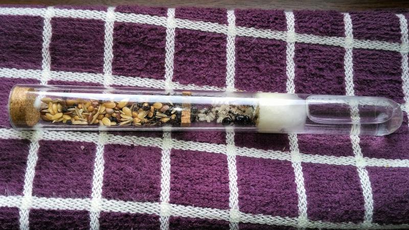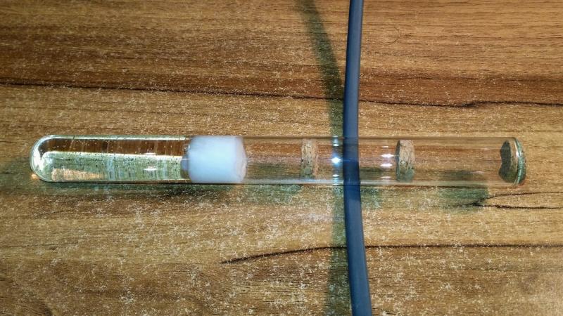 W probówkę wstawiam przegrody z korka, które dzielą ją na komory. Tak wykonany first step zapewnia odpowiedni gradient wilgotności i daje poczucie bezpieczeństwa mieszkańcom. Ogrzewam takie probówki kablem grzewczym bez termoregulatora, umieszczając kabel w poprzek probówki aby ogrzewał mała jej część. Ważne jest żeby nie ogrzewać komory wilgotnej (tej przy wacie oddzielającej wodę). Bo jeśli podgrzejemy tę komorę, watę lub zbiorniczek z wodą, to woda będzie parować, skraplać się na ściankach probówki i ściekać zalewając mrówki.