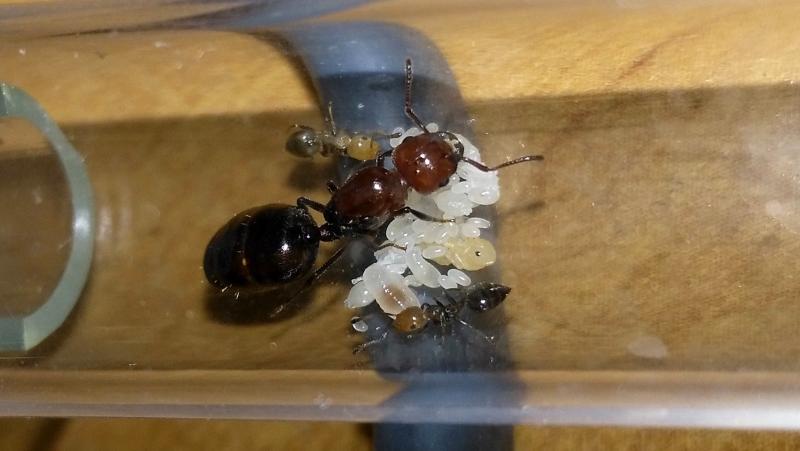 Tutaj królowa Crematogaster scutellaris wygrzewająca potomstwo bezpośrednio nad kablem grzewczym.