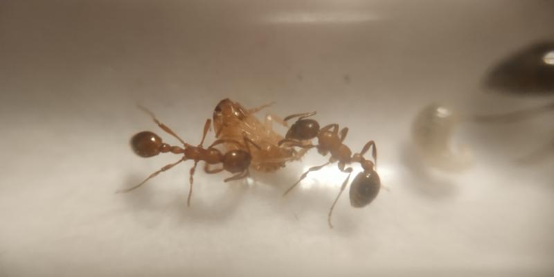 W kolonii znajdują się już 2 robotnice. Będąc na giełdzie terrarystycznej w Rybniku, kupiłem wylęg karaczana tureckiego, by urozmaicić dietę moim mrówkom.