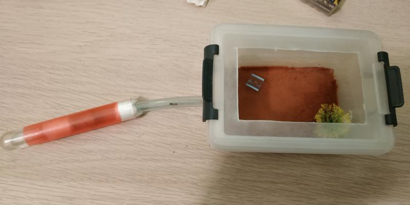 Po przybyciu do domu, przygotowałem nową probówkę oraz tymczasową arenę, zrobioną z pudełka po surówce. Po wszystkim, delikatnie przeniosłem królową z probówki na arenę.