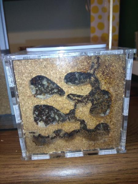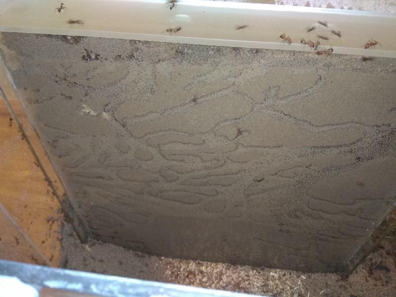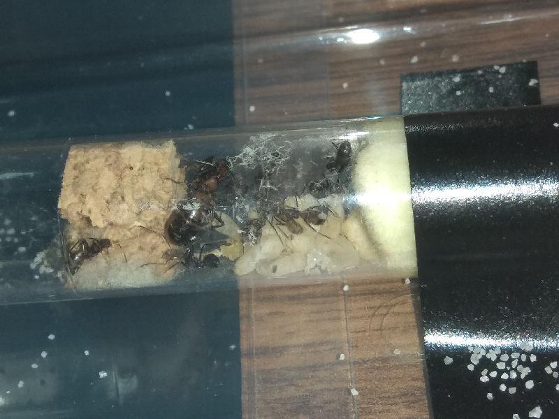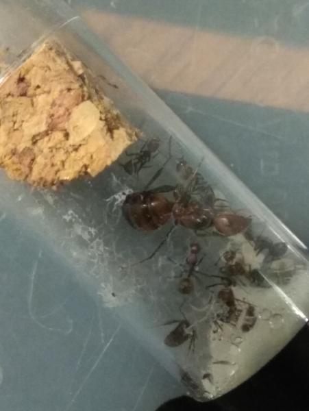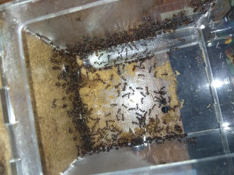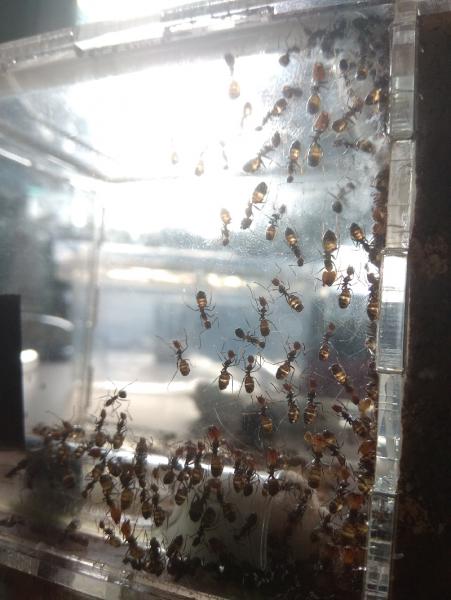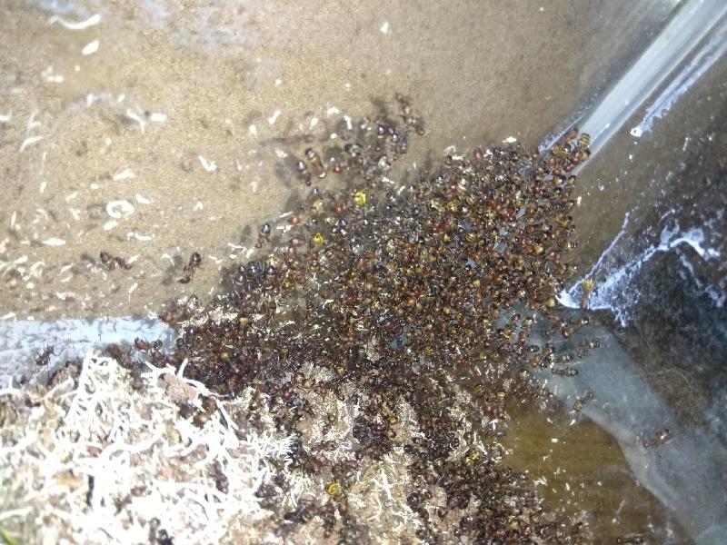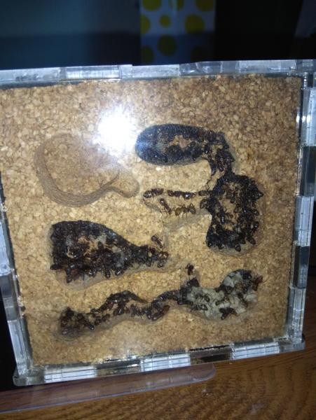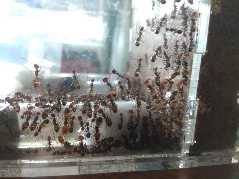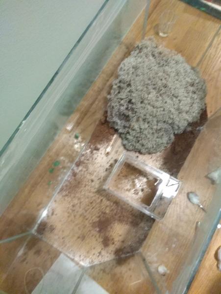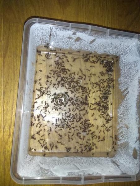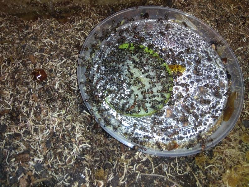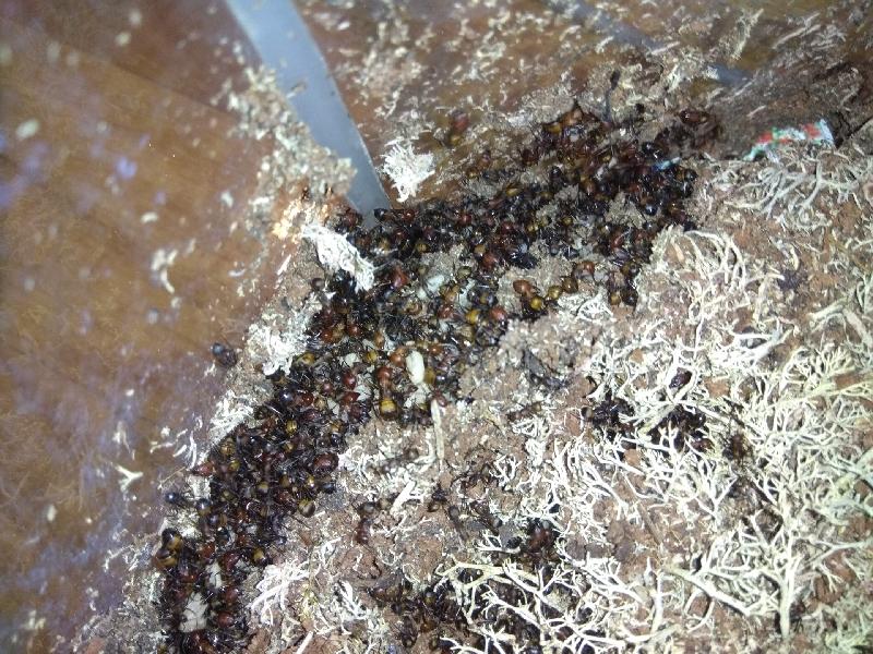 8 lutego dostały pierwsze gniazdo. Było to gniazdo korkowe "KATOWICE" które zostało mi po jakiejś wcześniejszej kolonii. Mrówki bardzo szybko się w nim zaaklimatyzowały jednak przez długi czas nie drążyły w korku. Zaczęły to robić dopiero gdy tak naprawdę przestały się mieścić w dostępnym dla nich miejscu. Wtedy drążenie zaczęło się na dobre i szybko przegryzły się do kolejnych komór. Kolonia zjadała (i dalej zjada) ogromne ilości miodu jak i owadów karmowych. Nie były w ogóle wybredne. Co dostawały to jadły ze smakiem. A jednym z ich ulubionych zajęć po objedzeniu się miodem było wylegiwanie się na ścianach areny. Wszystko szło dobrze aż do 10 sierpnia... Generalnie mrówki już ledwo się mieściły w gnieździe (było ich koło 400) i od dłuższego czasu planowałem dla nich nowe. Nie mogłem się jednak zdecydować jakie ma ono być. Czy korkowe, czy jakieś wiwarium czy jeszcze coś innego. Był to czas wakacji i wyjechałem na dwa tygodnie. Obiecałem sobie i mrówkom, że jak wrócę zrobię/kupię im odpowiednie gniazdo. Niestety mrówki nie były cierpliwe. Gdy wróciłem z wakacji własnie 10 sierpnia zastałem pełno mrówek w pokoju... Okazało się, że mrówki przegryzły się przez gumową zatyczkę do otworu w arenie i przez niego wyszły. Pół kolonii przeniosło się do pobliskiego kwiatka a reszta została w starym gnieździe tudzież krążyła po pokoju. Musiałem improwizować więc na szybko przełożyłem wszystko (kwiatek, formi i mrówki, które wyłapałem z pokoju) do starego akwarium, które uprzednio zabezpieczyłem talkiem. Niestety talk załatwiał sprawę tylko na jakieś pół h. Użyłem więc talkoholu. Ten w przeciwieństwie do suchego talku działał dłużej bo "aż" 3 dni. Wtedy zaczął się cały cyrk z tymi mrówkami. Codzienne ucieczki, brak porządnego gniazda... Uznałem na początku, że w sumie fajnie wyglądają w tej ziemii więc może je po prostu zostawię tak jak są. Tak też zrobiłem. Dosypałem ziemii a na wierzchu położyłem trochę rzeczy, które przywiozłem z wakacji (trochę ciekawego mchu i jeden duży porost). Dodam, że nie było to pod ochroną. Połowa kolonii wraz z królową zamieszkała pod tym porostem natomiast reszta kolonii z potomstwem została w gnieździe korkowym. Tak minęły z 2 miesiące. W między czasie szukałem różnych sposobów jak powstrzymać mrówki przed ucieczkami. Po różnych perypetiach i kombinacjach udało się zakończyć ucieczki. Zastosowałem pokrywę korkową, której głównie używam w nocy (gdy aktywność mrówek jest najwyższa). Mrówki szybko ogarnęły, że droga ucieczki została odcięta i zaniechały ich zupełnie co pozwala na odkrywanie akwarium w godzinach dziennych (głównie od 14-16 do północy). Od kiedy stosuję taki system nie uciekła mi ani jedna mrówka. Oczywiście inne bariery też są (suchy smar PTFE i fluon) ale pewnie na dłuższą metę by nie dały rady.