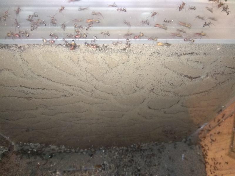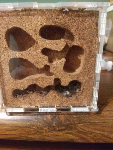 Wiadome się stało, że przeprowadzka musi się odbyć jak najszybciej... Niestety moje zamówienie z gniazdami i arenami z różnych względów uległo opóźnieniu. Zaskutkowało to tym, że mrówki, które przestały się mieścić w gnieździe zaczęły na potęgę drążyć w pokrywie korkowej... Zaczęła się codzienna walka i łapanie mrówek w pokoju. Mrówki uciekały setkami. Nie mogłem się doczekać kiedy je wszystkie przeprowadzę i będę miał spokój z ucieczkami.