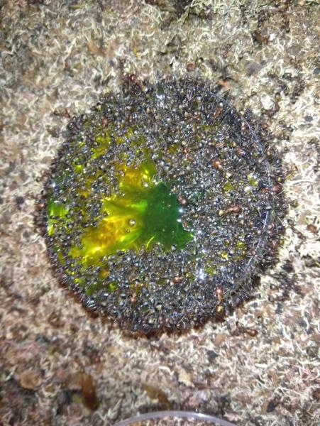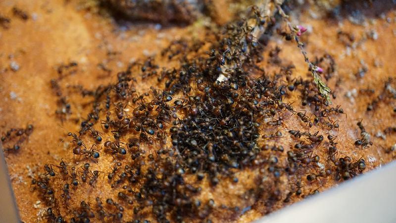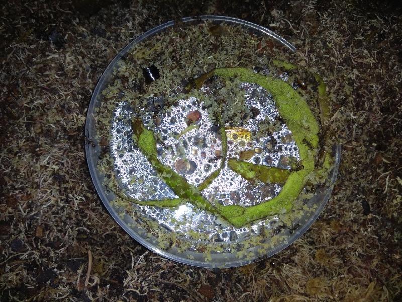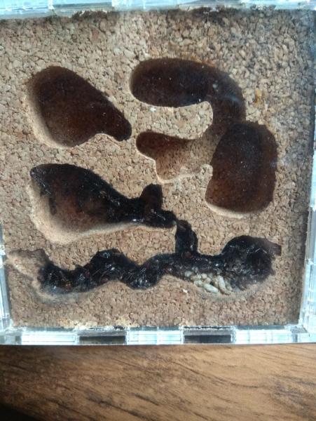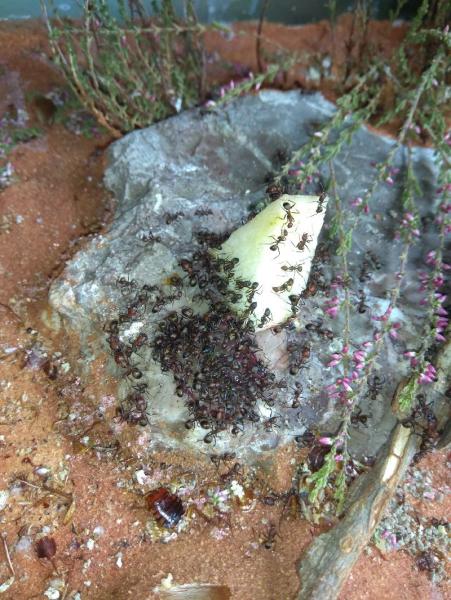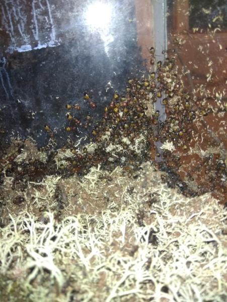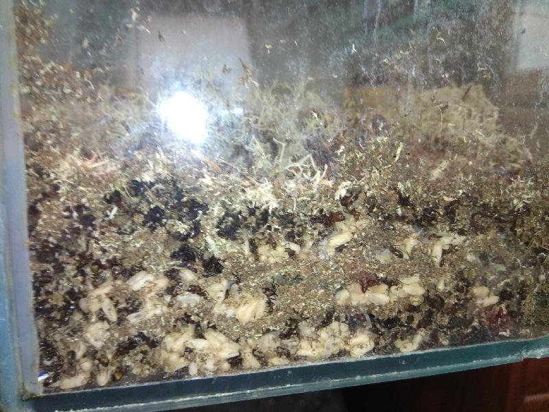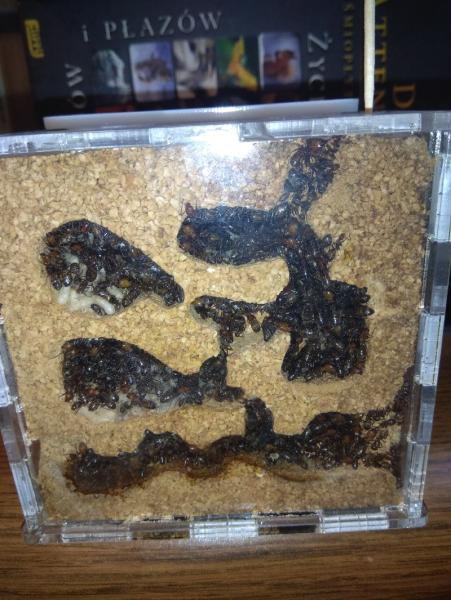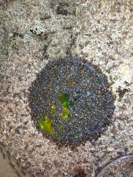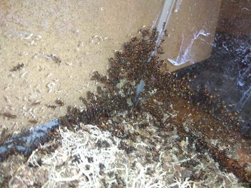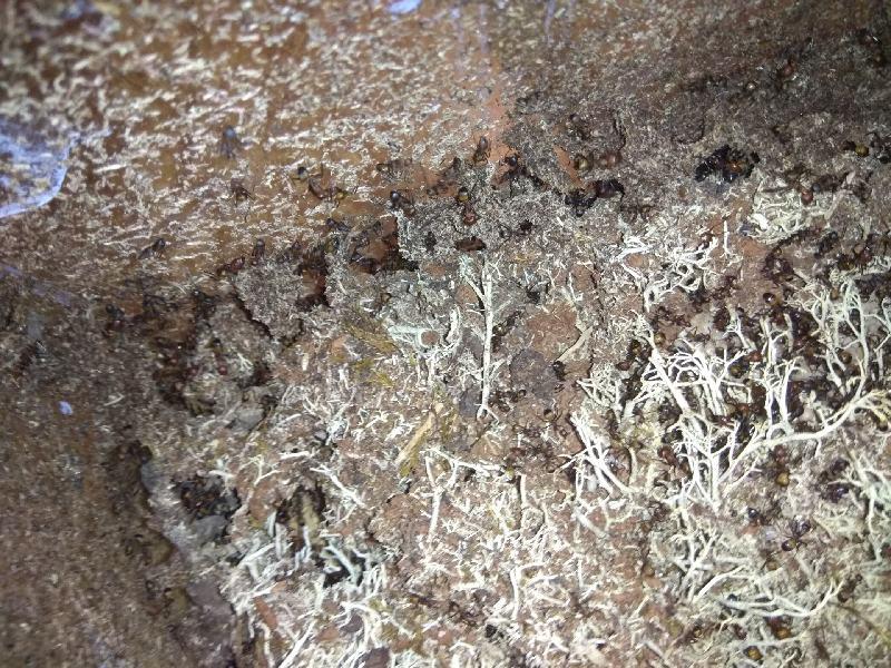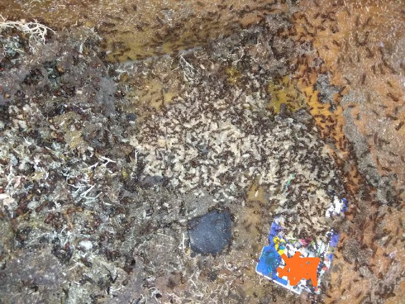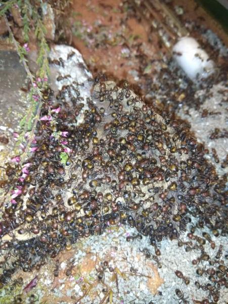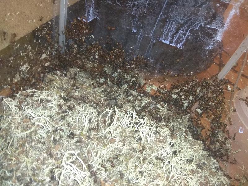 W ten sposób dochodzimy do ostatnich dni/tygodni. Liczebność mrówek jest ciężka do sprawdzenia gdyż żyją ciągle pod porostem (przeniosły się tam całą kolonią) jednak patrząc na liczbę potomstwa jak i robotnic i ich apetyt mogę oszacować, że jest ich koło 2 tysięcy.