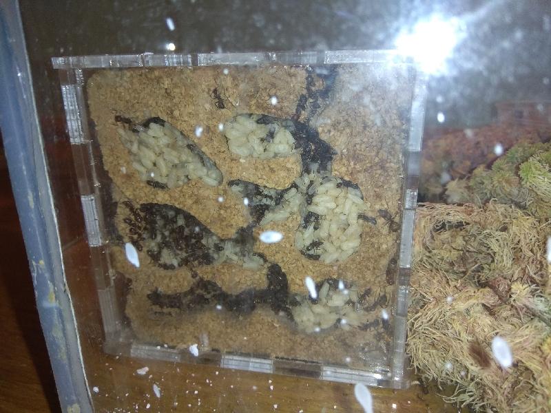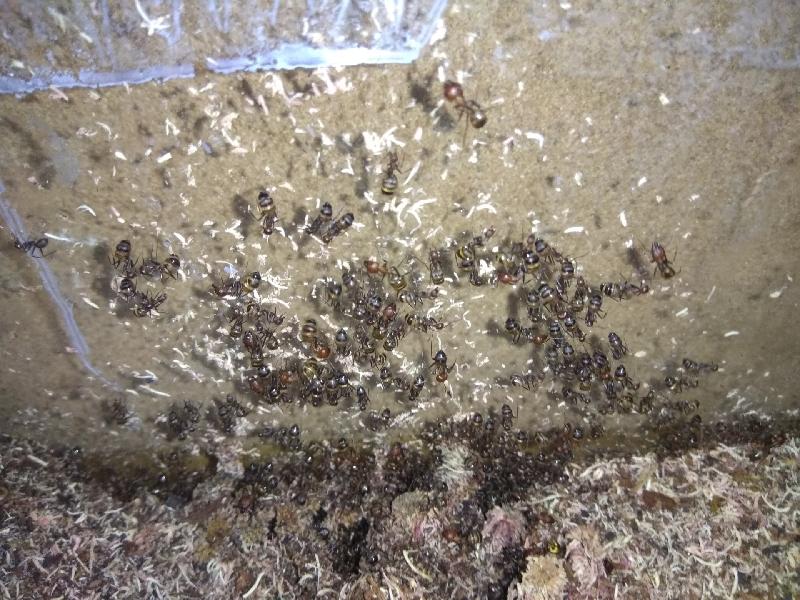 Nie do końca wiem czemu to ma służyć... Raczej nie do budowy oprzędu (jak u Ponerinae) bo larwy były za małe. Może coś z wilgotnoscią związane. Jak ktoś ma jakiś pomysł to chętnie usłyszę.