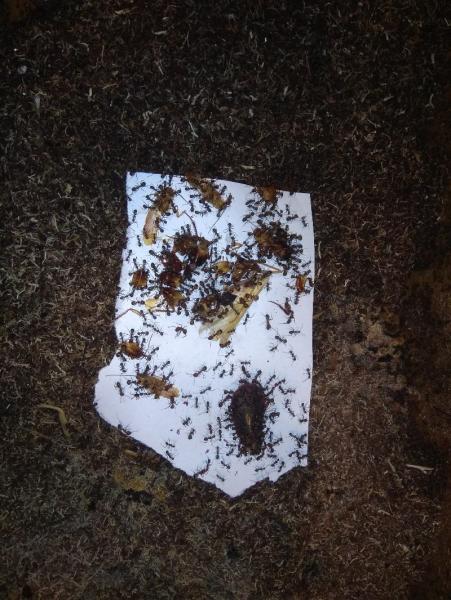Któregoś wieczora zaobserwowałem, że na arenie co druga robotnica ma w żuwaczkach kawałek trupa. Dziwne, że tak dużo nagle tego było... Widziałem też jak 3 robotnice rozrywały jednego trupa. Co gorsza potem zauważyłem też coś takiego z żywą robotnicą...
