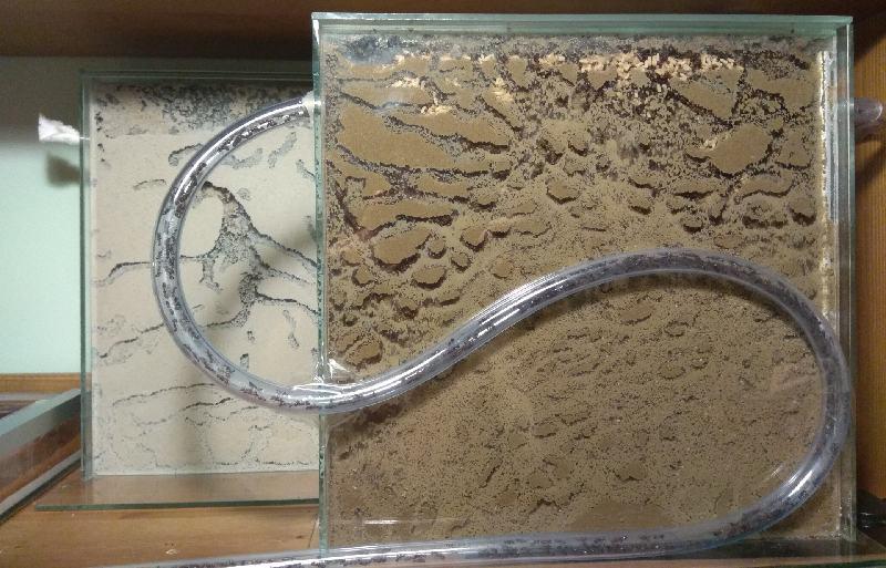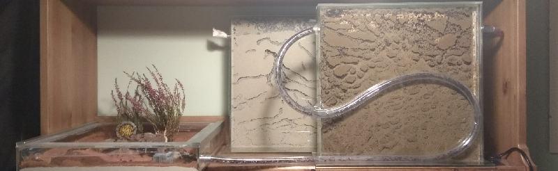 Następnego dnia czyli 25 marca podjąłem decyzję o przeprowadzeniu mrówek. Wiedziałem, że operacja nie będzie łatwa. Musiałem wyciągnąć sandwiche (na których było pełno mrówek) z akwarium, następnie oczyścić je z mrówek i ziemi, zakleić nowo powstałe pęknięcia a następnie podłączyć do nowej areny. Na koniec wyłapać kilkaset mrówek z akwarium i dać na nową arenę.